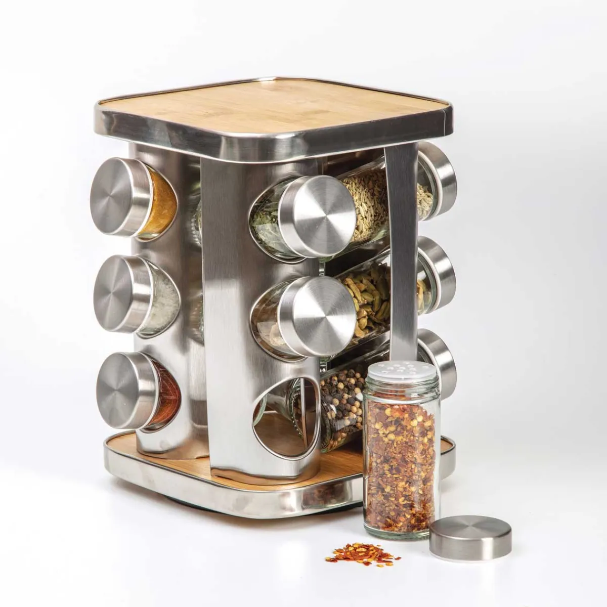 Juego 12 Tarros Para Especias Con Soporte | 23x18x18cm | Bambú FSC y marco de acero inoxidable | Apto para lavavajillas | ¿Sabías que tu cocina puede ser el lugar más feliz del mundo? Echa un vistazo a nuestra gama de utensilios para una cocina llena de Happy Home Living. ¡Cocinar con los utensilios adecuados es mucho más fácil! | Color: Beige, Plateado | Medidas: 23x18x18cm | Material: Acero inoxidable, Bambú, Vidrio | Marca: 5Five