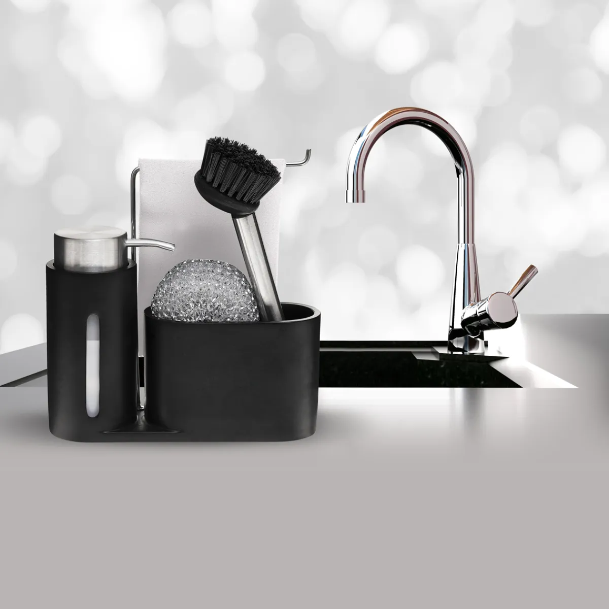 Dosificador De Cocina Con Estropajo Y Cepillo | 22x6x19cm | La funcionalidad en la cocina es esencial y comienza con las soluciones de almacenamiento para la cocina. Desde el carrito multiusos, al botellero o los cubos de basura y reciclaje, encuéntralo todo en homa.es | Color: Negro | Medidas: 22x6x19cm | Material: Poliresina | Marca: 5Five