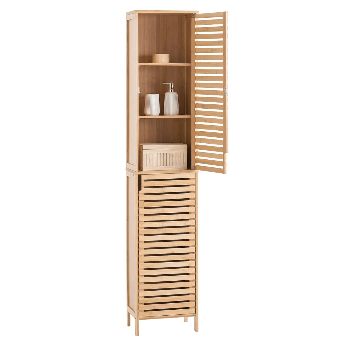 Armario Alto Para Baño Sicela | 34x24x170cm | Descubre nuestra colección de muebles de baño. Varias propuestas de muebles de baño, muebles auxiliares y muebles de lavabo para un espacio lleno de almacenaje y muy actual | Color: Marrón Camel | Medidas: 170x24x32.5cm | Material: Bambú, Mdf, Acero | Marca: 5Five