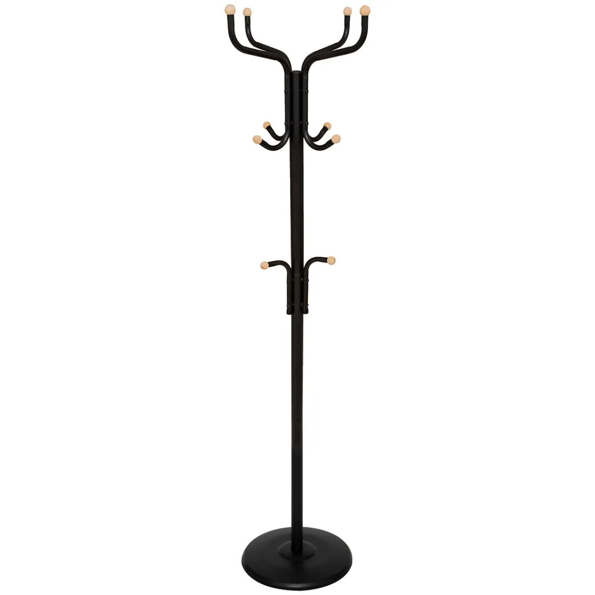 Perchero De Pie Negro Metálico Con 11 Ganchos | 177.8x43x43cm | Perchero con bolas de madera. 2 niveles de ganchos: 8 a nivel alto y 3 a nivel inferior (altura para niños). Base redonda con el peso adecuado para una buena estabilidad / Carga soportada = 15kg | Conoce este y más artículos que tenemos disponibles para tu closet . Almacenar y organizar tus armarios y roperos nunca fue tan fácil. Descubre la gama de Organización hôma | Color: Negro | Medidas: 177.8x43x43cm | Material: Metal | Marca: 5Five