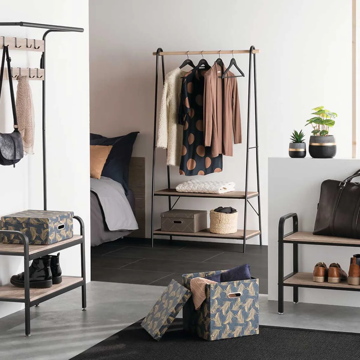 Perchero Con 10 Ganchos Y Zapatero | La combinación de metal y madera puede hacer de esta pieza un destaque en tu decoración, al mismo tiempo que favorece el almacenaje y la organización | La «Retro Factory» invade tu espacio, presentándote el colgador con zapatero de la línea «Jano». Tiene un zapatero integrado con 2 niveles, una barra para perchas y 10 ganchos incorporados. No te faltarán soluciones de almacenaje