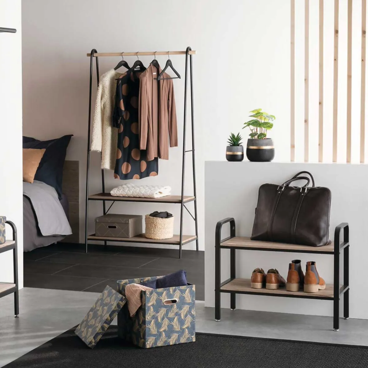 Zapatero JANO de madera | Medidas: 71x34x57.5cm | Con una influencia «Retro Factory» en la que el metal negro se combina con la madera, podrá adaptarse fácilmente a su decoración. Con 2 estantes, tiene capacidad para 6 pares de zapatos