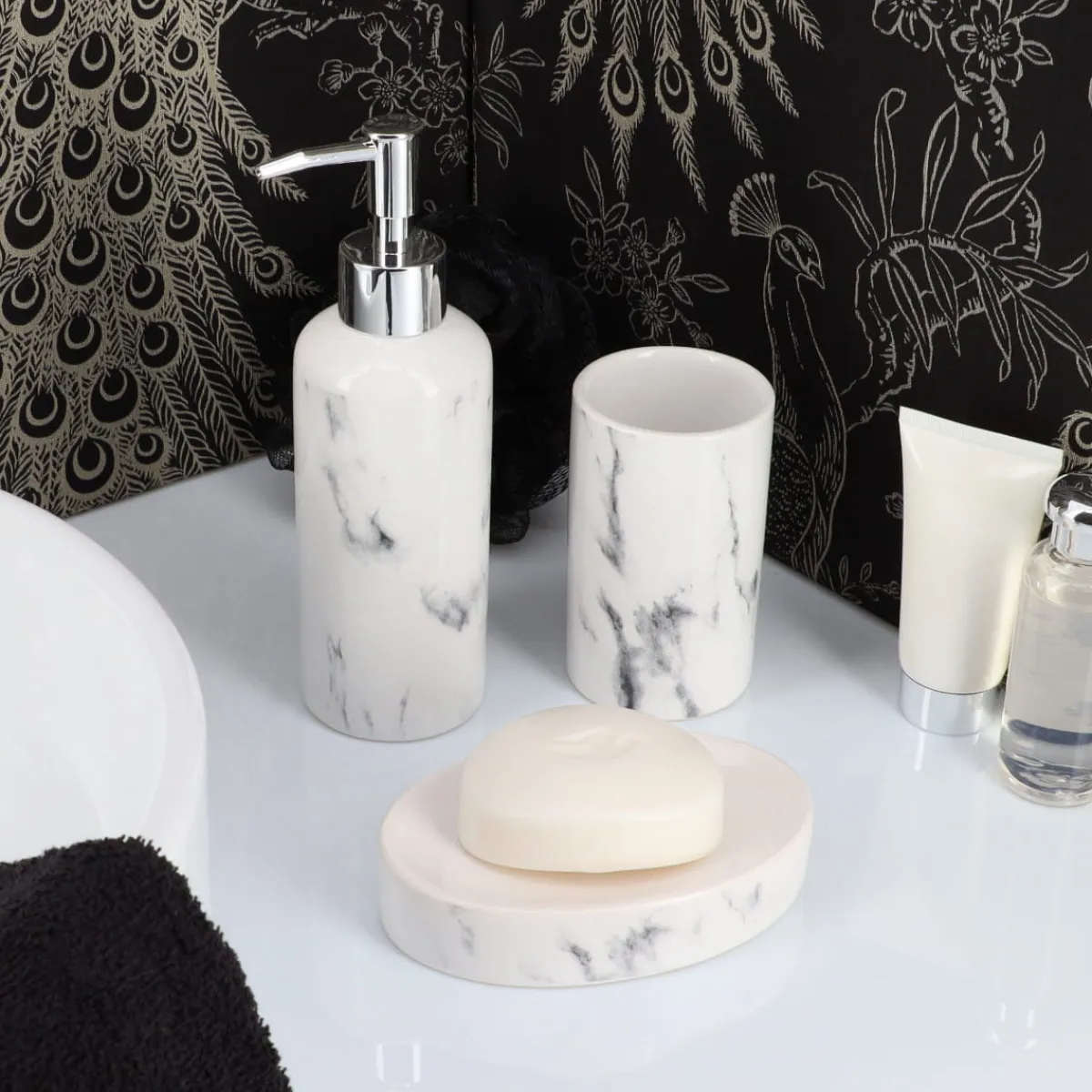 Dispensador De Jabón Líquido De Cerámica Efecto Mármol | Medidas: 20.5x6cm | Los accesorios y la organización del baño son esenciales para que tus rutinas más personales te traigan todo el bienestar que te mereces. ¡Conoce nuestra colección de accesorios para el baño!