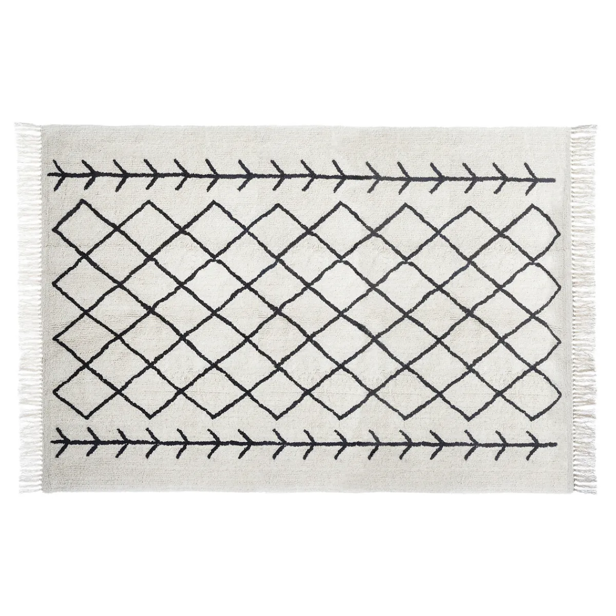 Alfombra Delhi Con Flecos 120x170cm | ¡En homa.es encontrarás alfombras para toda tu casa! Alfombras de salón, alfombras de dormitorio, alfombras redondas, etc.Tus pies te lo agradecerán y el espacio ganará una nueva dimensión con nuestras propuestas de decoración para el suelo | Color: Blanco, Negro | Medidas: 120x170cm | Material: Algodón | Marca: Atmopshera
