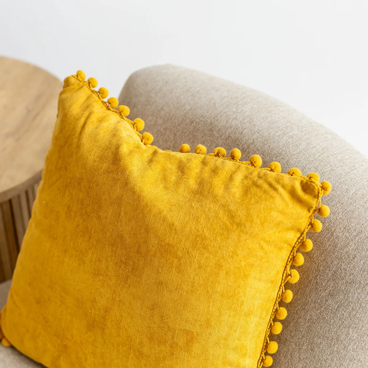 Cojín Ocre Con Pompones 40x40cm | La colección textil hôma reúne propuestas únicas para personalizar tu hogar. Desde cojines decorativos y fundas de cojín hasta las mantas más confortables, ¡vive en tu hogar con toda comodidad! | Color: Ocre | Medidas: 40x40cm | Material: Poliéster, Nailon | Marca: Atmopshera