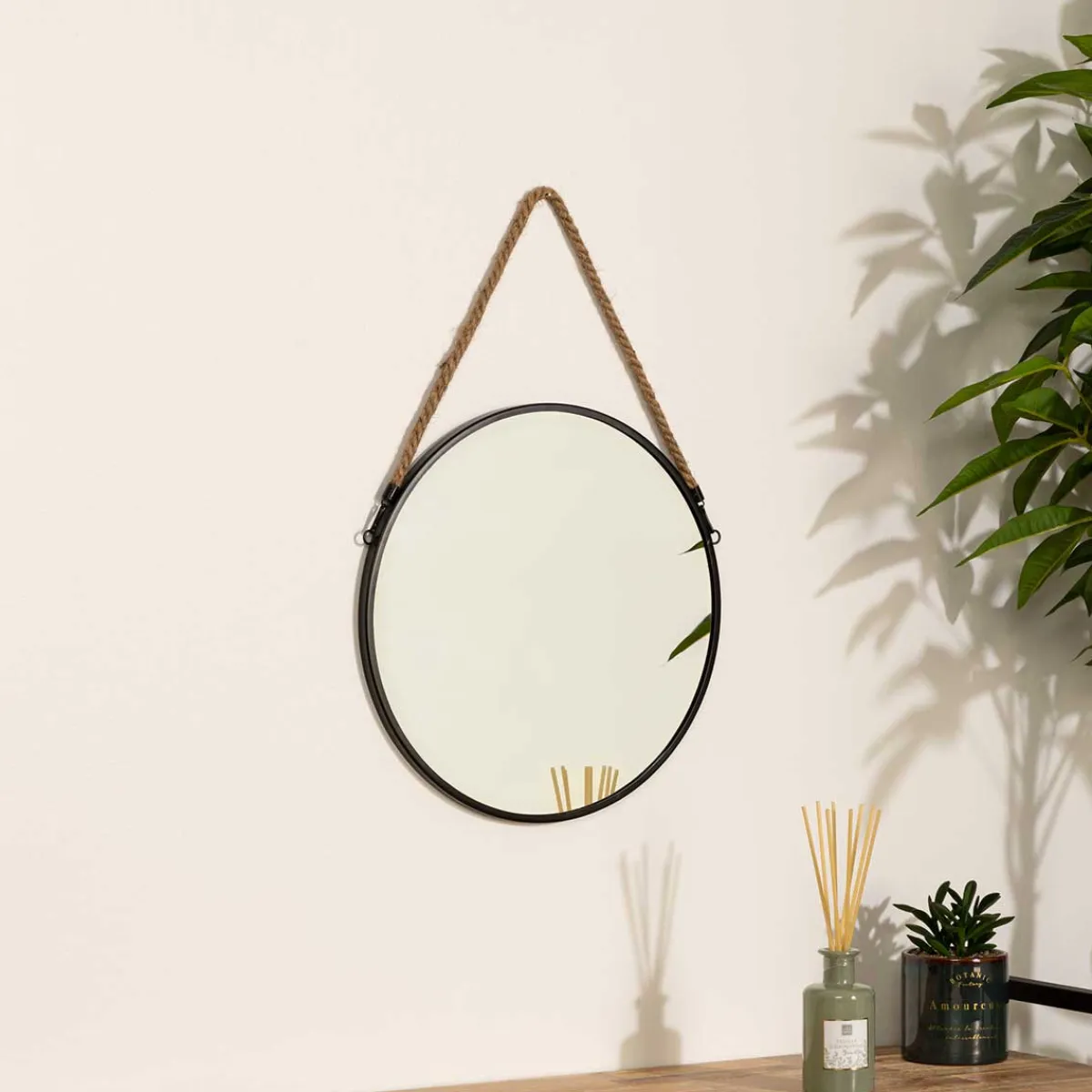 Espejo de pared redondo metal 38Cm | Descubre este y otros espejos decorativos hôma para tu hogar | Color: Negro, marrón | Medidas: 38×1,5x38cm | Material: Metal, vidrio, yute | Marca: Atmosphera
