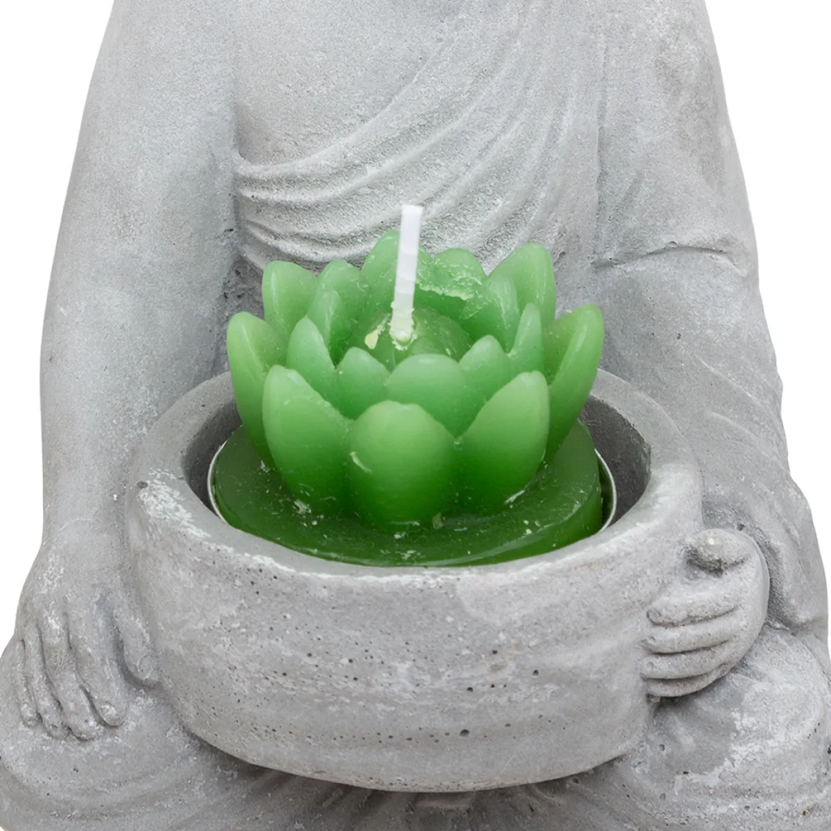 Estatua De Buda Con Vela | 16×8.5x10cm | Descubre nuestra gama de portavelas, faroles y candelabros y encuentra el que mejor se adapta a la decoración de tu hogar | Color: Gris, Verde | Medidas: 16×8.5x10cm | Material: Cemento, Cera | Marca: Atmosphera