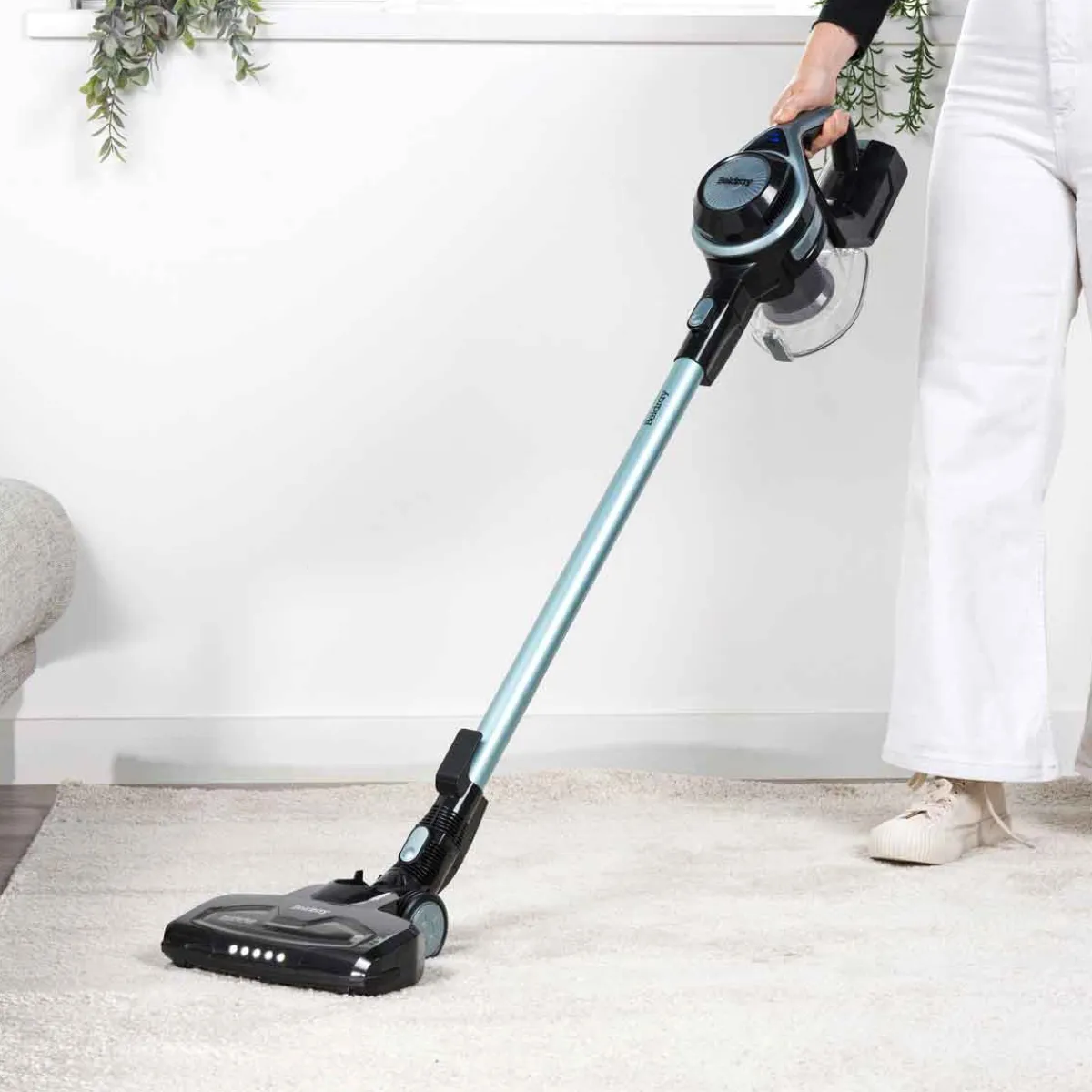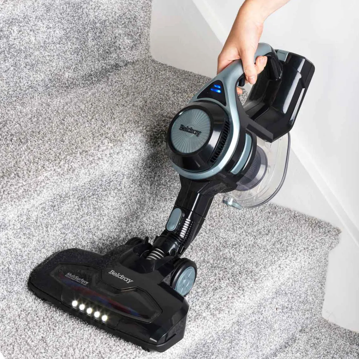 Aspirador Vertical Sin Cable Beldray 22.2V| Batería extraíble de iones de litio de 22.2 V para una potencia duradera de hasta 40 minutos de uso, con 1 carga y dos ajustes de velocidad con función boost, para una potente recogida. Contenedor de polvo de 1.2 litros, fácil de vaciar. Filtro hepa lavable, ideal para alérgicos. Incluye cepillo motorizado para el suelo con luces led, perfecto para los dueños de mascotas | Almacenamiento compacto con gancho. Unidad portátil – ideal para usar en escaleras y en el coche | Accesorios incluidos: herramienta para hendiduras 2 en 1 y cepillo | Color: Azul, Negro | Medidas: 117x25x22cm | Material: ABS