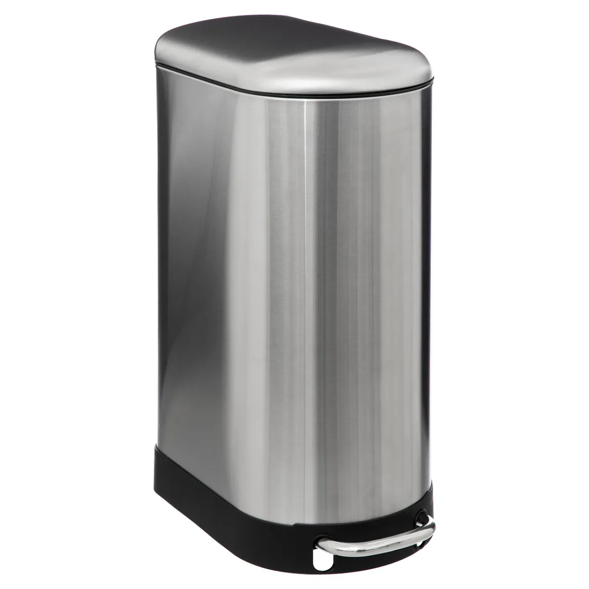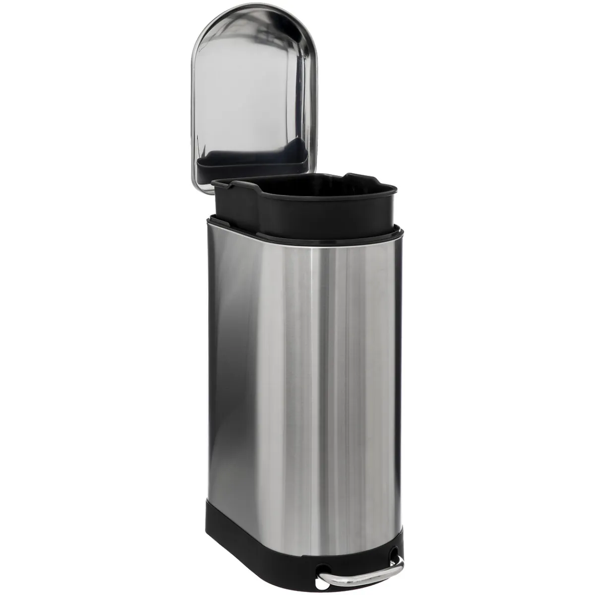 Cubo De Basura De Acero Inoxidable 30L Plateado| 62.2x25x42.5cm | Formato fino ideal para ser colocado entre dos muebles o en una esquina | Sistema de cierre suave (drop lock) que permite un cierre suave y silencioso de la tapa. Contiene cubo extraíble que facilita la limpieza | El cubo contiene dos asas para facilitar el transporte y un orificio para fijar la bolsa. El asa trasera facilita el transporte de los residuos | Dos batientes situados debajo del cubo, con almohadillas de goma, pueden abatirse para evitar que dañe las paredes o se mueva al abrirse | Color: Plateado, Negro | Medidas: 62.2x25x42.5cm | Material: Polipropileno, Abs, Acero Inoxidable | Capacidad: 30L