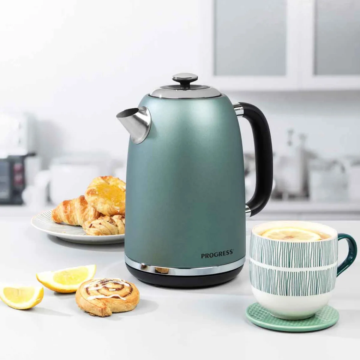 Hervidor eléctrico PROGRESS SHIMMER 2200w | Potencia máxima: 2200w | Indicador de nivel de agua. Controlador Strix. Tapa con cierre de seguridad. Indicador luminoso de encendido. Protección contra la levadura seca. | ¿Sabías que tu cocina puede ser el lugar más feliz del mundo? Descubre nuestra gama de utensilios para una cocina llena de Happy Home Living. ¡Cocinar con los utensilios adecuados es mucho más fácil! | Color: Verde | Medidas: 21.8×17.2×21.3cm | Material: Acero inoxidable | Capacidad: 1,7L