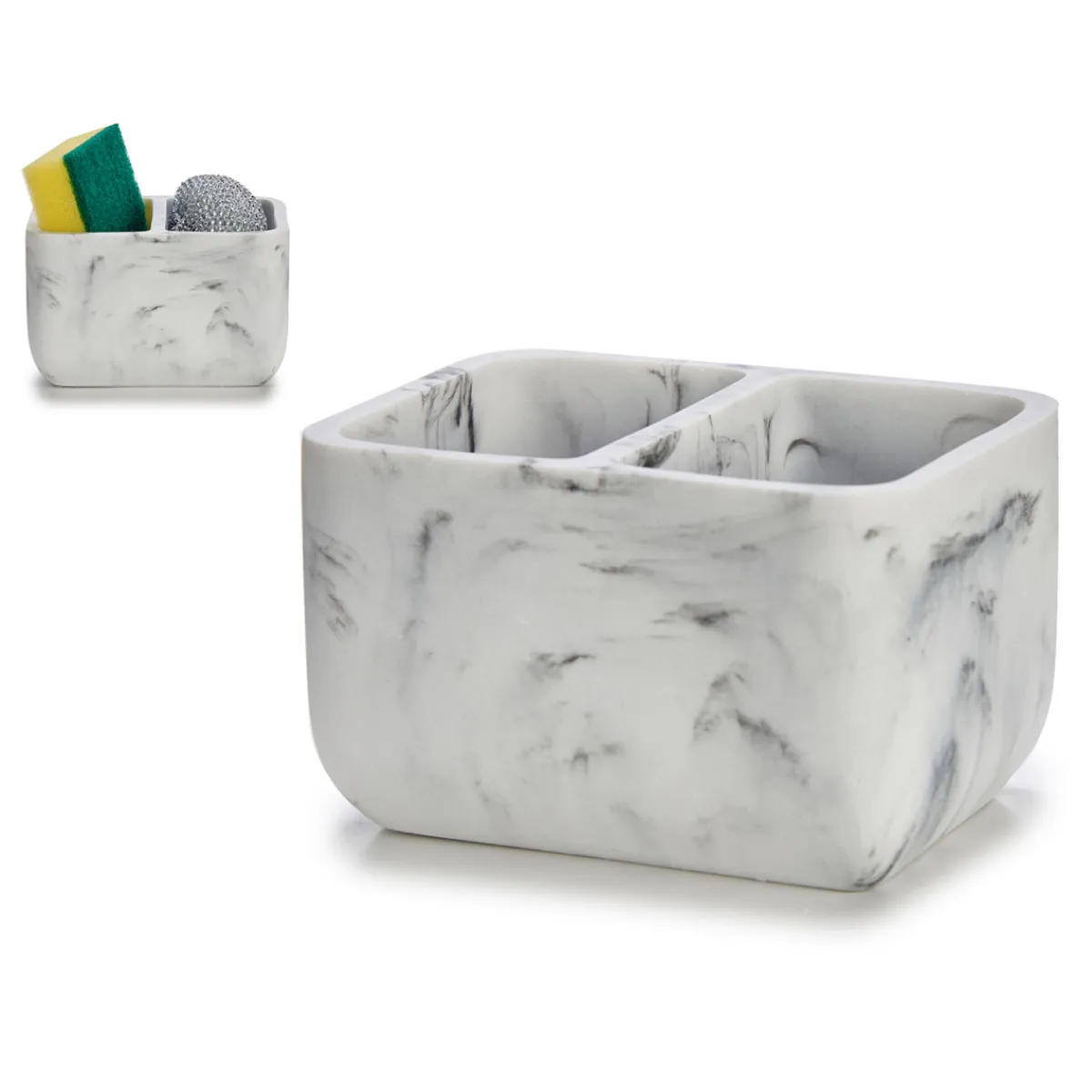 Porta Estropajo Doble Para Fregona De Mármol | 7×9.5×12.5cm | La funcionalidad en la cocina es esencial y comienza con las soluciones de almacenamiento para la cocina. Desde el carrito multiusos, al botellero o los cubos de basura y reciclaje, encuéntralo todo en homa.es | Color: Blanco, Gris | Medidas: 7×9.5×12.5cm | Material: Mármol