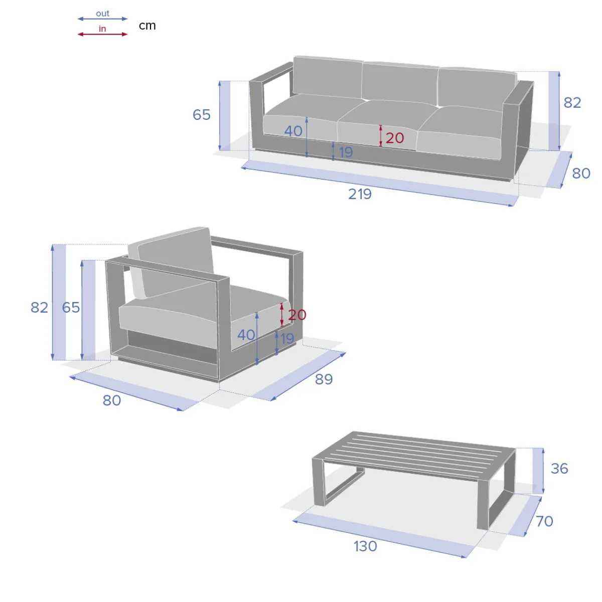 Juego de jardín ALLURE blanco 5 plazas | Estructura Blanca y cojínes grises | Aluminio y Poliéster | Estructura con tratamiento epóxi antioxidante. Cojines removibles para facilitar la limpieza. Tejido con tratamiento repelente al agua que permite que el agua se deslize sin penetrar el material. Producto tratado contra la decoloración. Pies ajustables para compensar pisos irregulares y proporcionar mejor estabilidad. Peso máximo soportado por persona: 110Kg | Butaca: 65x80x89cm; Sofá de 3 plazas: 65x80x219cm; Mesa de centro: 36x70x130cm | Color: Blanco | Material: Aluminio, Poliéster | Marca: Hespéride