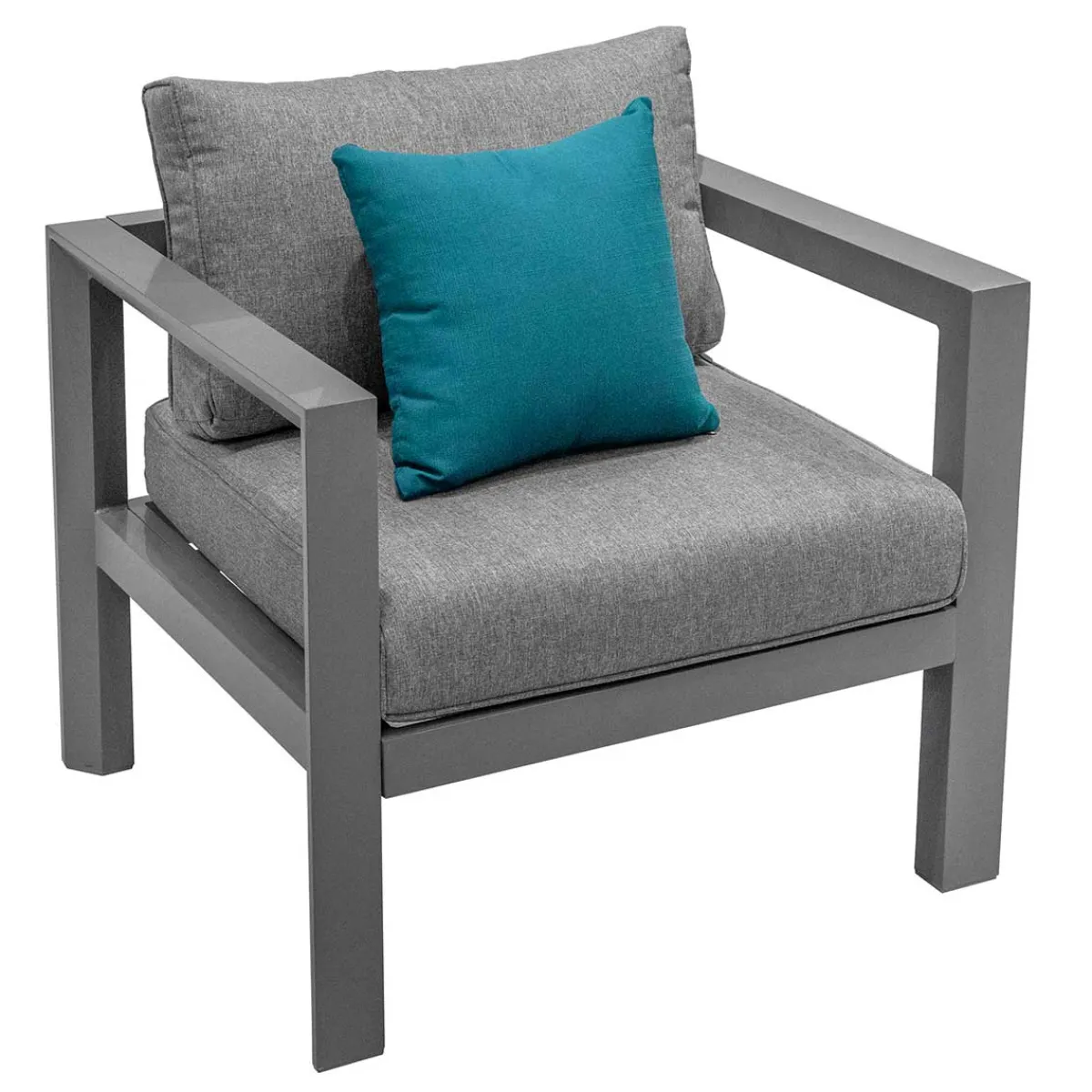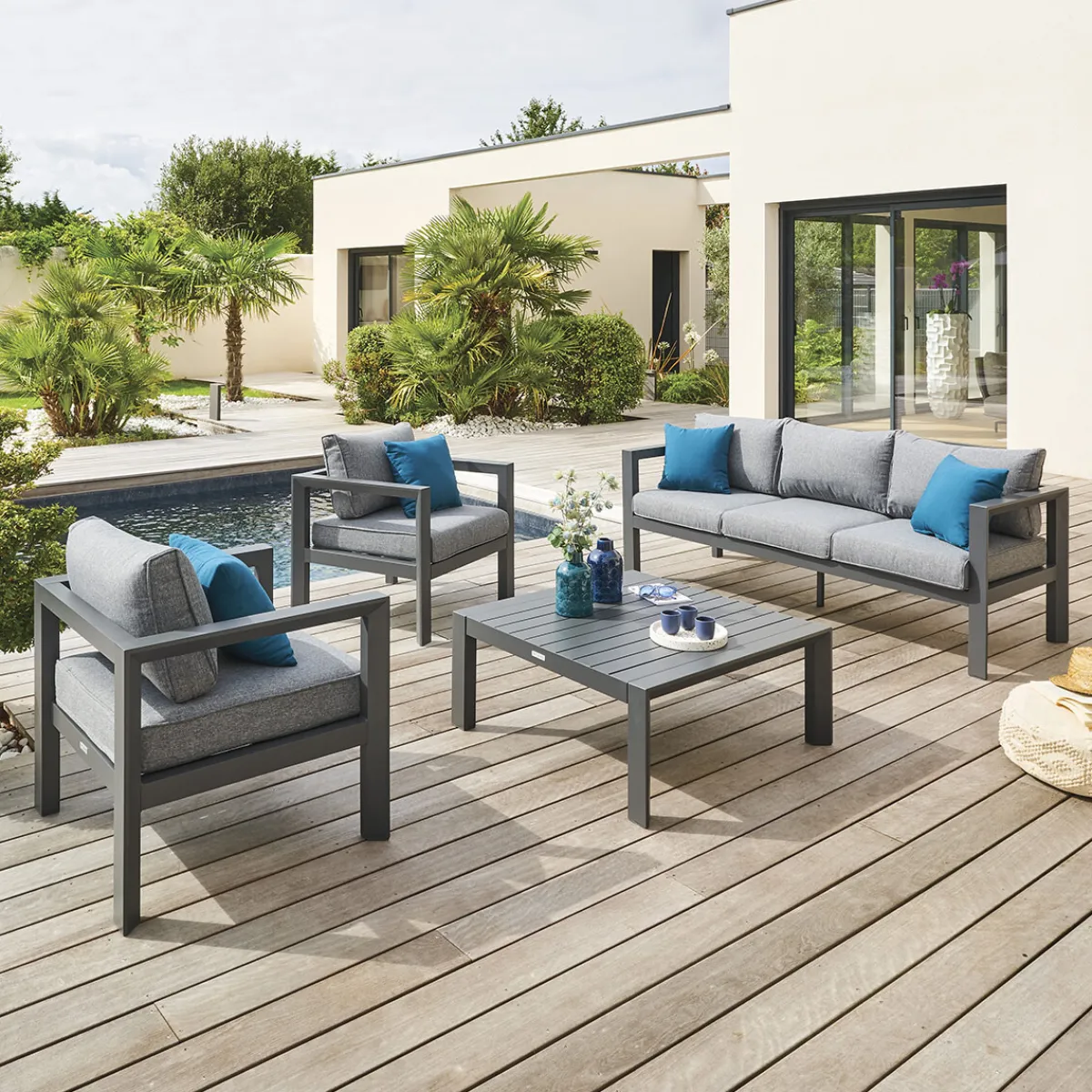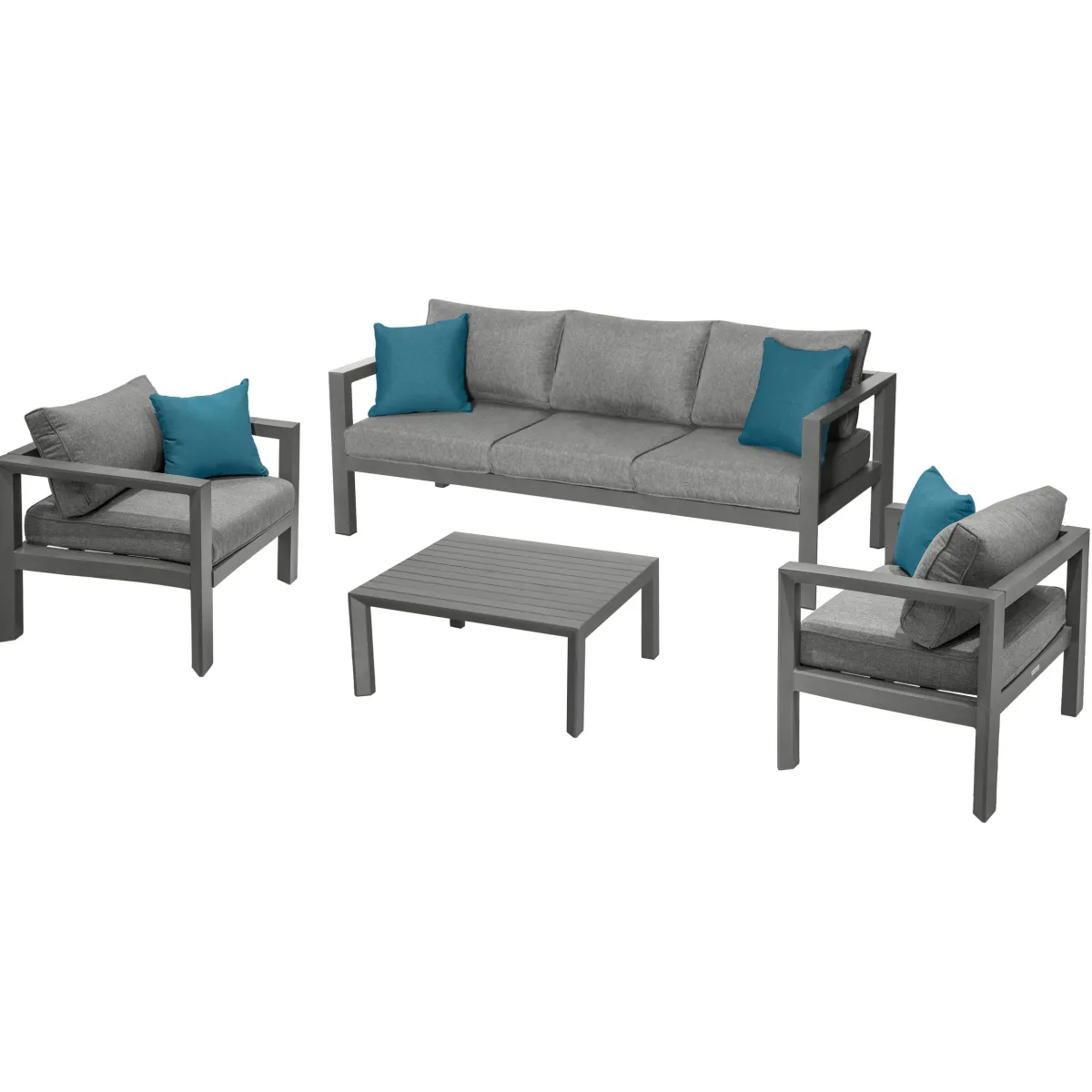 Juego de jardín EVASIÓN 5 plazas gris grafito | Compuesto por 2 sillones 77.5x71x65cm, 1 sofá de 3 plazas 190x71x65cm, 1 mesa 87×87,3x38cm | Estructura tratada con epoxi antioxidante y resistente a los rayos UV | Se puede quitar la funda de los cojines para facilitar su limpieza | Peso máximo soportado por plaza: 110Kg | 5 Cojines | Color: Grafito, Azul | Material: Aluminio, Poliéster | Marca: Hespéride | Cojines decorativos no incluidos