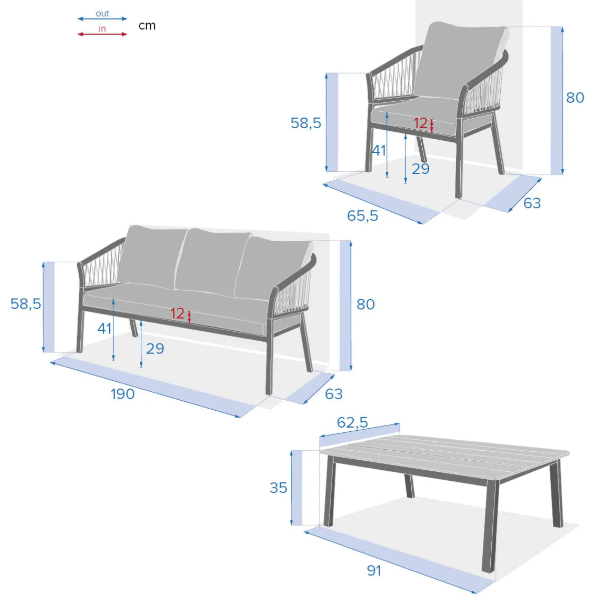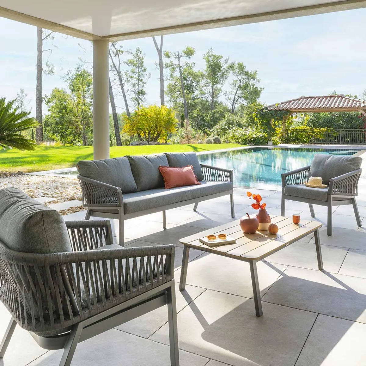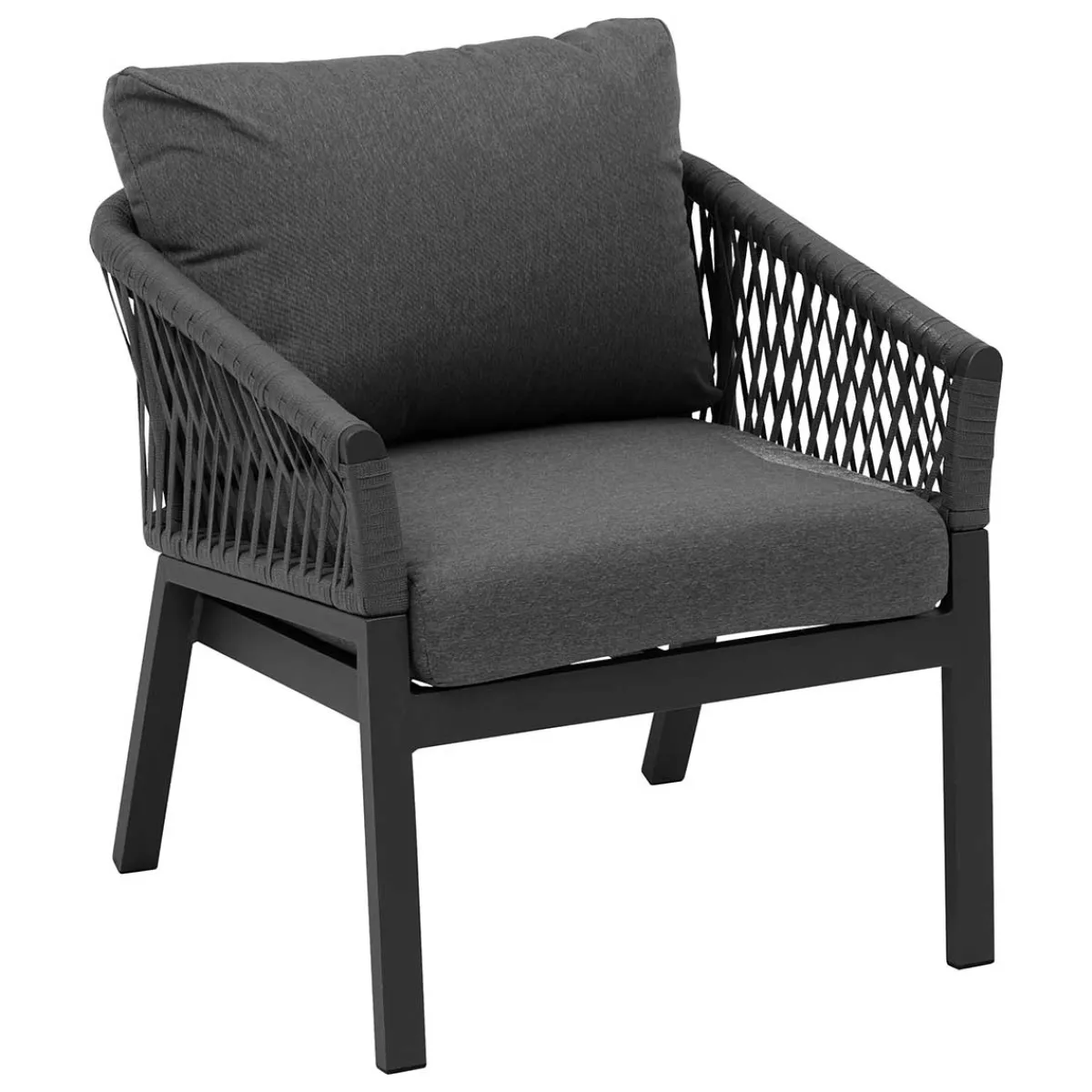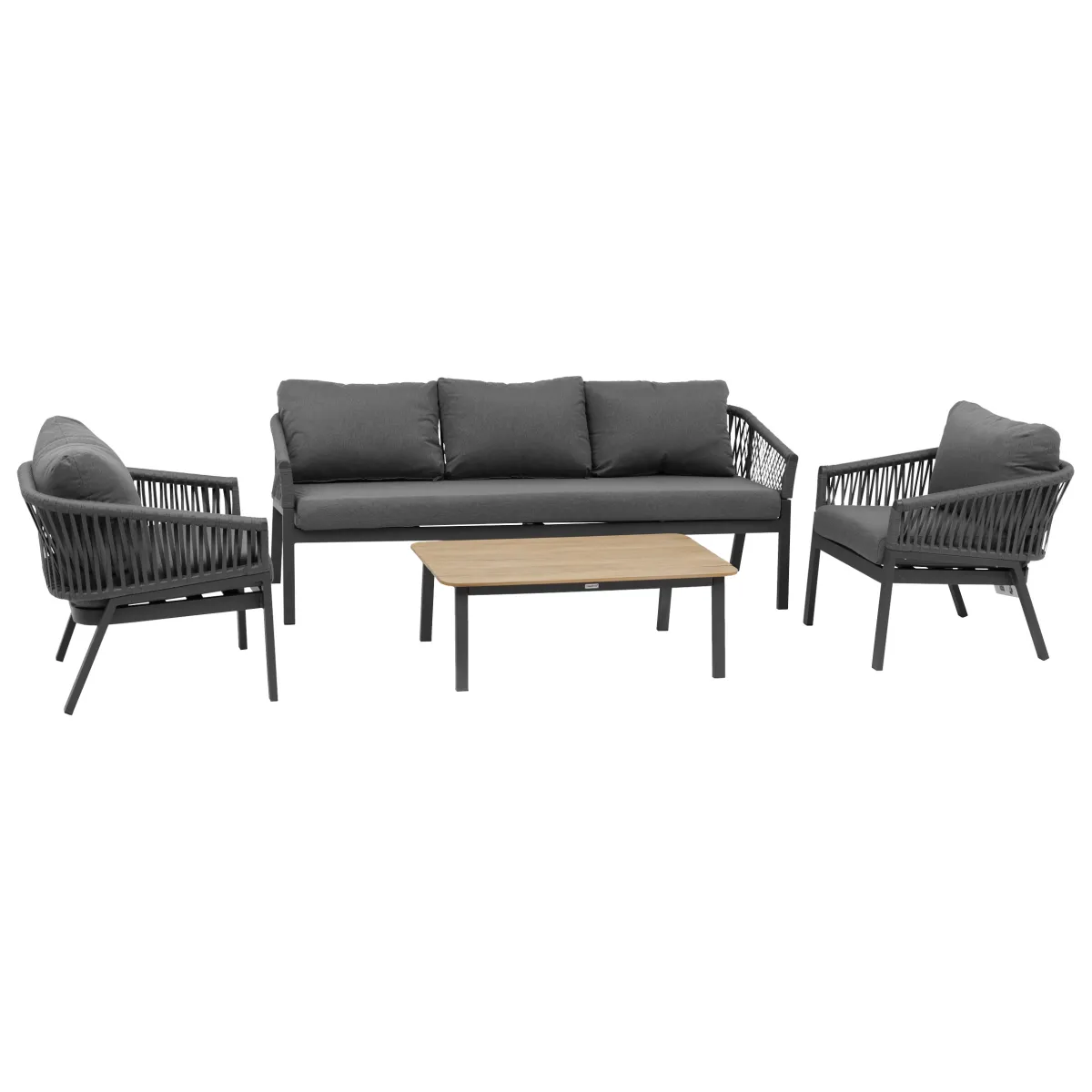 Juego de jardín ORIENGO gris oscuro | 5 Plazas | Compuesto por un sofá de tres plazas, dos sillones y una mesa de centro con tapa de madera barnizada con certificado Fsc. Los respaldos de cuerda añaden un toque de originalidad al conjunto. La estructura de aluminio con tratamiento epoxi es resistente a la oxidación. Se puede quitar la funda de los cojines para facilitar su limpieza. Durante el invierno, guarda tus muebles de jardín y protégelos con una funda | Color: Antracita, Grafito | Material: Aluminio, Madera de acacia, Poliéster | Marca: Hespéride