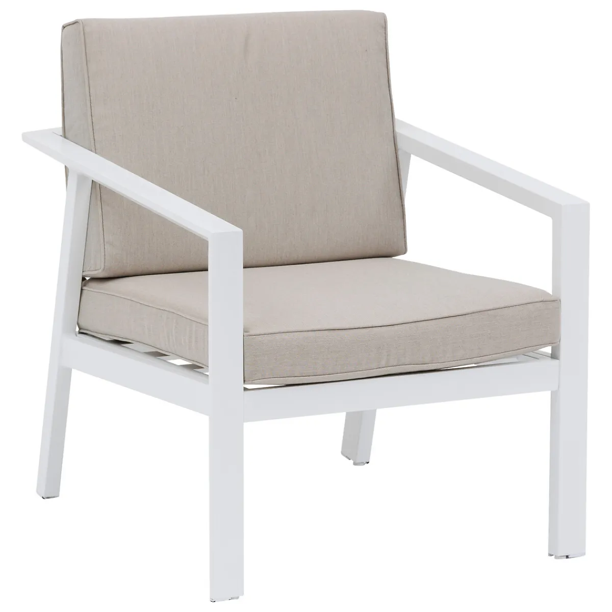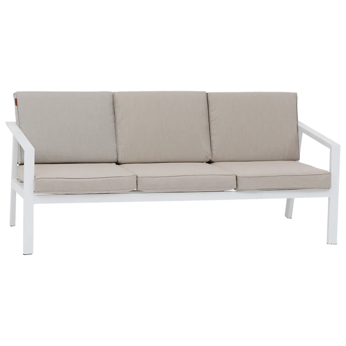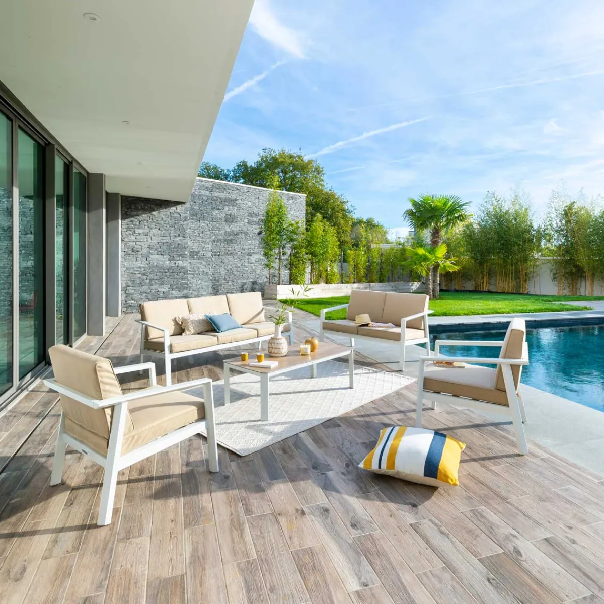 Juego de jardín PAVANE blanco | 5 Plazas | Compuesto por 2 sillones 69x73x63cm, 1 sofá de 3 plazas 63x73x185cm, 1 mesa de centro 39x60x120cm | Estructura antioxidante tratada con epoxi. Se puede quitar la funda de los cojines para facilitar su limpieza | Compatible con la referencia 412381 para proteger sus muebles del sol y de las inclemencias del tiempo. Producto tratado contra la decoloración | Peso máximo soportado por plaza: 110 kg | Color: Blanco | Material: Aluminio, Poliéster | Marca: Hespéride