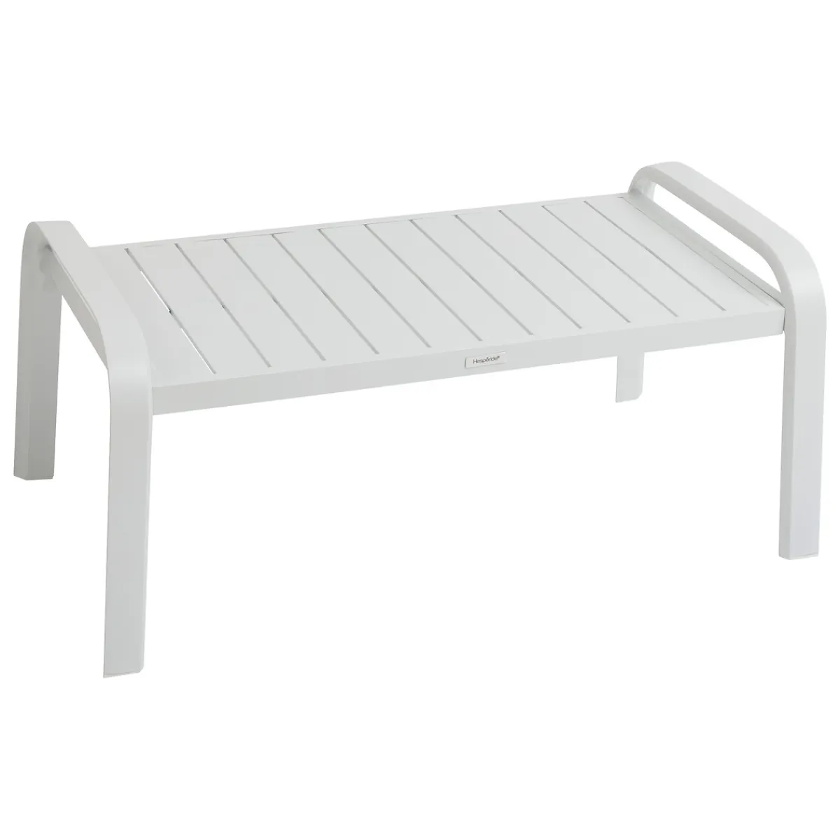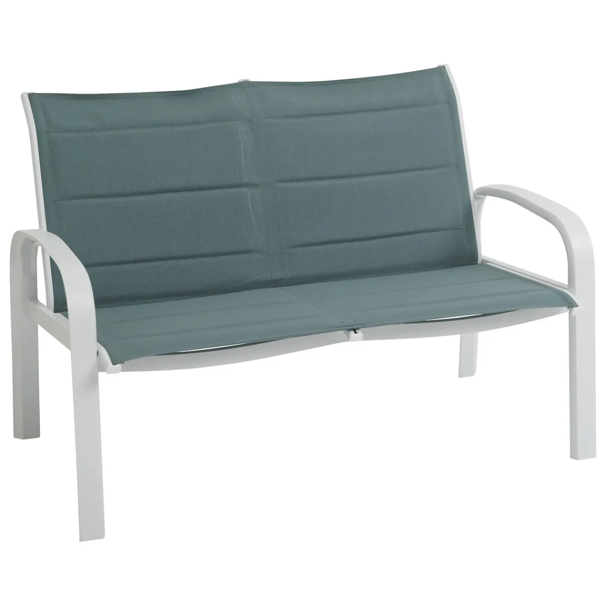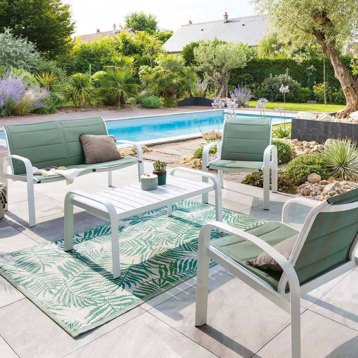 Juego ELYN verde claro y blanco de 4 plazas | Compuesto por 2 sillones, 1 sofá de 2 plazas y 1 mesa de centro | Medidas del sillón: 84x70x66cm; Medidas del sofá: 84x70x122cm; Medidas de la mesa: 46x60x104.7cm | Una creación acolchada para un confort óptimo. Espuma de secado rápido. Estructura tratada con epoxi. Producto tratado contra la decoloración, pies ajustables para compensar las irregularidades del suelo y proporcionar una mayor estabilidad. Peso máximo autorizado por persona: 110 Kg | Color del armazón: Blanco ; Color del asiento/respaldo: Verde jade | Material: Aluminio, Texaline | Marca: Hespéride