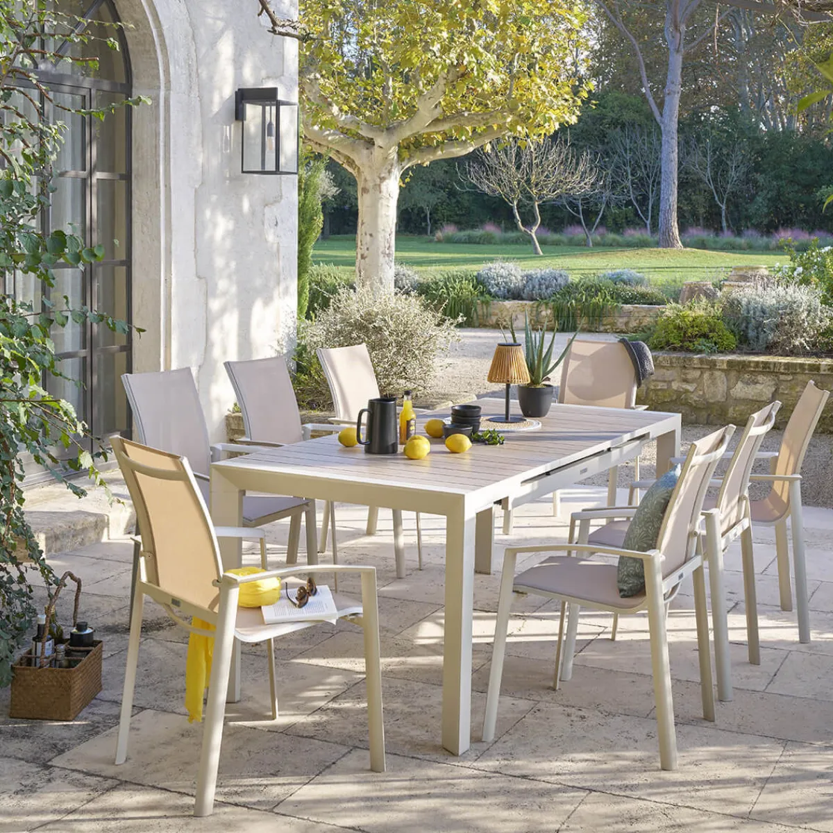 Mesa extensible automática ÉVASION lin y argile | Hasta 8 plazas | Aluminio, tapa ECP efecto madera | 77x90x142cm | Extensión automática | Tipo de tratamiento: epoxi | Material del tapa: ECP (Extrudado calcita-plástico) | Patas regulables | Color: Lin, Argile | Medidas: 77x90x142cm | Material: Aluminio | Marca: Hespéride
