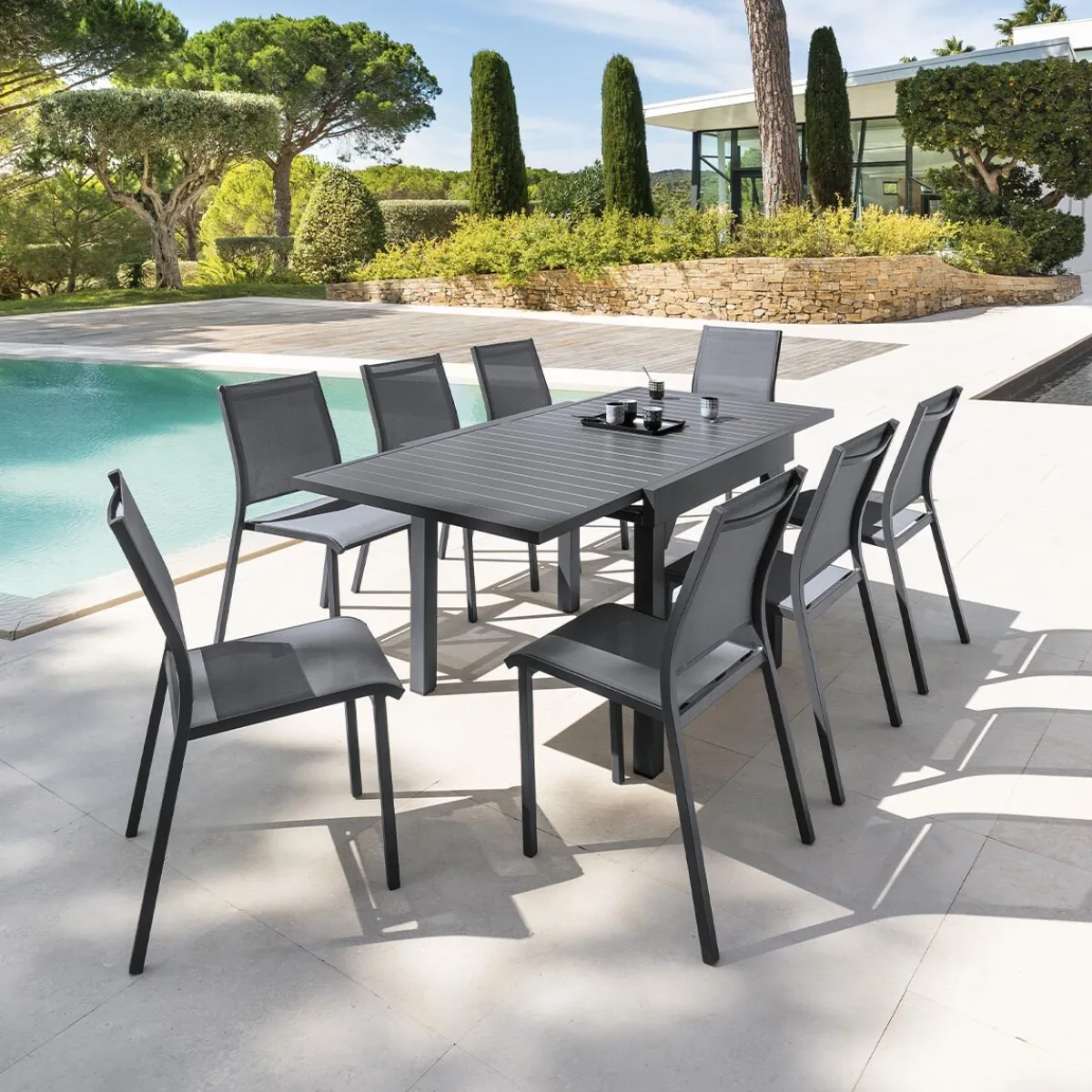 Mesa extensible PIAZZA gris graphite 90-180cm | Hasta 8 Sillas | Estructura con tratamiento epoxi antioxidante | Producto tratado contra la decoloración | Gracias a su extensión deslizante, la mesa se adapta al número de comensales descrito previamente | Las patas de la mesa son regulables para compensar las irregularidades del suelo y proporcionar una mayor estabilidad | Color: Gris Grafito | Medidas: 75x90x90-180cm | Material: Aluminio | Colección: Piazza | Marca: Hespéride