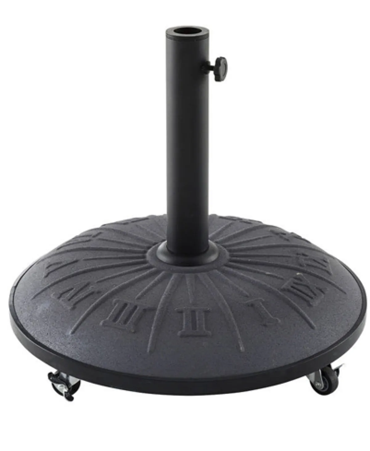 Base para parasol hormigón c/ruedas 25kg | ¡La originalidad de la base del parasol gris de 25kg te conquistará! Su forma de reloj de sol es un verdadero elemento decorativo en su jardín. Con un peso de 25kg, fabricada en acero y hormigón, le permitirá apoyar perfectamente su parasol. Podrá desplazarla fácilmente gracias a sus 4 ruedas. El tornillo de fijación y los 3 arandelas de reducción lo hacen compatible con estructuras de hasta 55mm de diámetro | Color: Gris | Medidas: 46.5x50x50cm | Material: Hormigón, Acero | Marca: Hespéride
