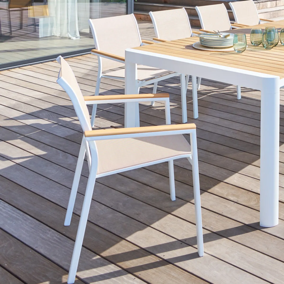 Silla ESSENTIA lino y blanco | Aluminio, Textilene, Madera, 88x56x63cm | Estructura tratada con epoxi antioxidante. Producto apilable, fácil de guardar para ahorrar espacio | Marca: Hésperide
