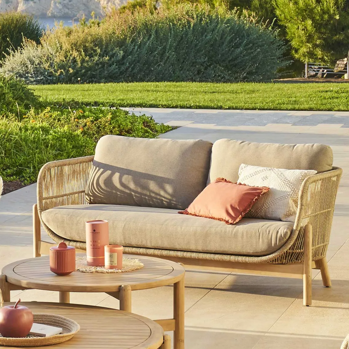 Sofá DEONA madera de acacia gris pardo | 2 Plazas | 79.5x78x178.5cm | Madera FSC, protegida con barniz. El mantenimiento debe realizarse según las recomendaciones de las instrucciones. Fundas de cojín extraíbles para facilitar la limpieza. El tejido hidrófugo permite que el agua resbale sin penetrar en el material. Puede personalizar su conjunto con una o varias referencias de la gama Deona | Marca: Hésperide