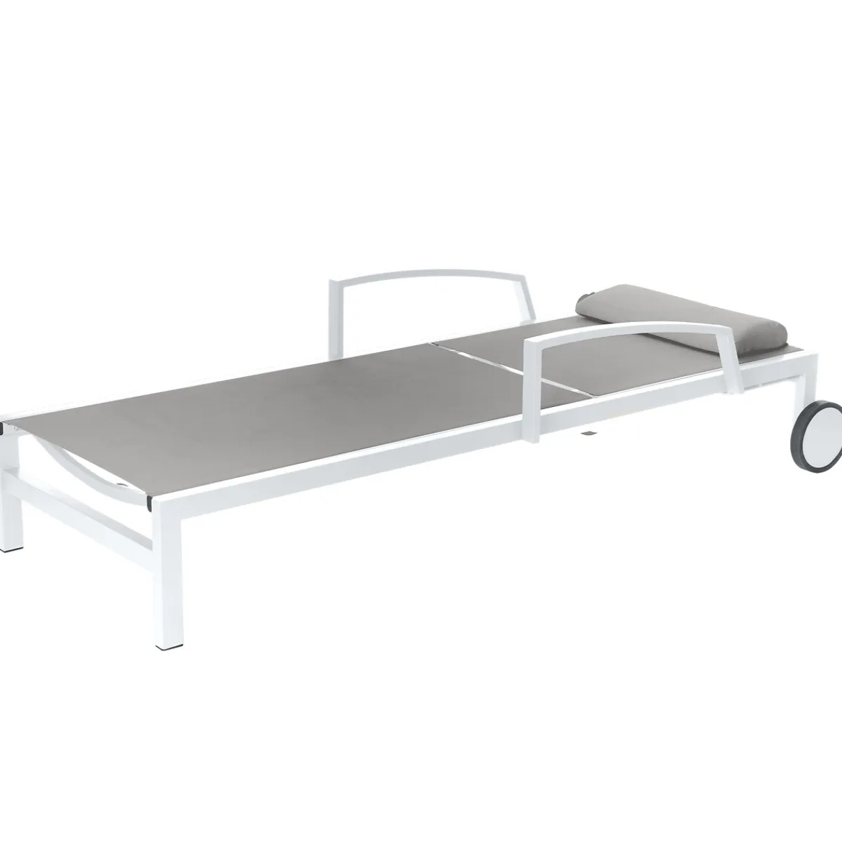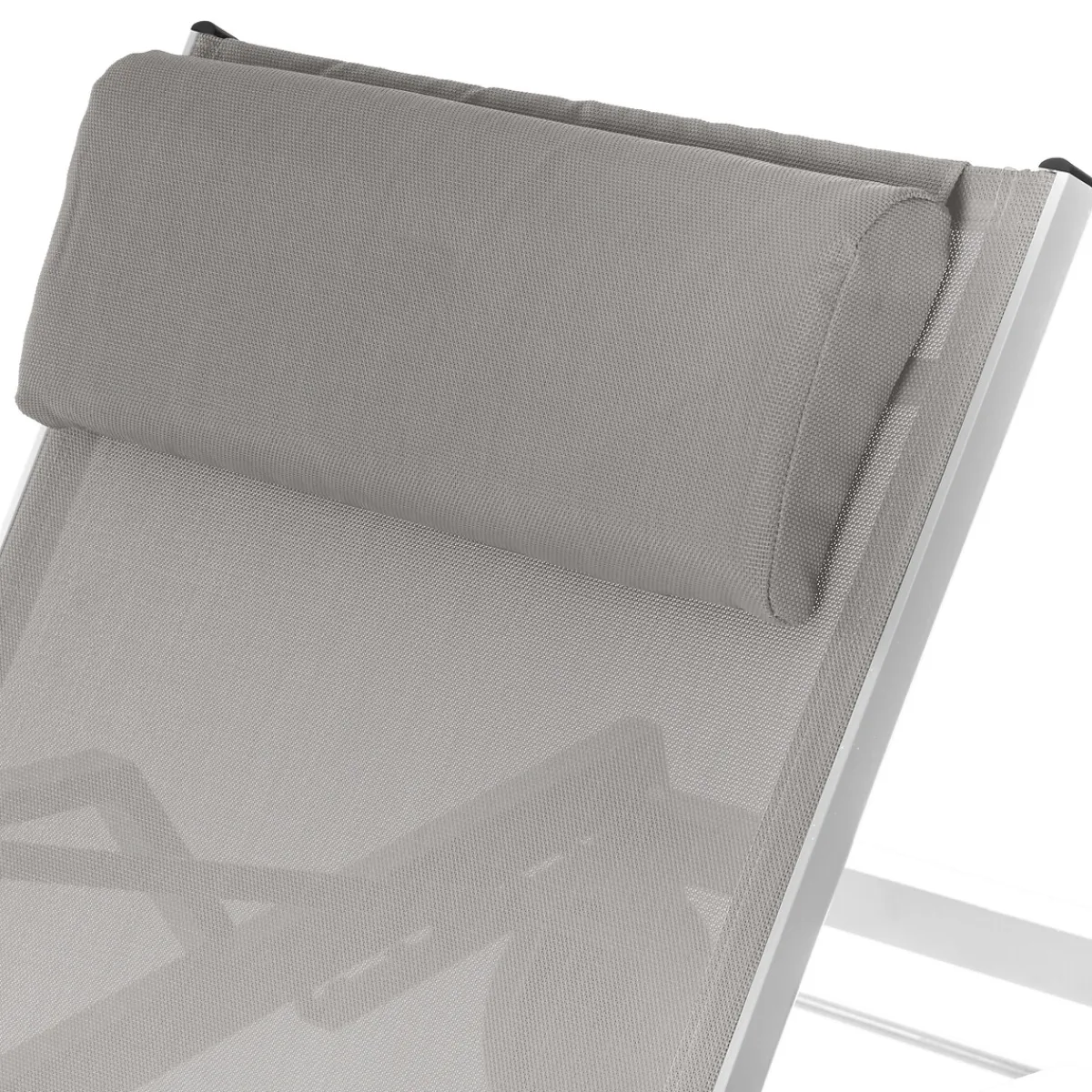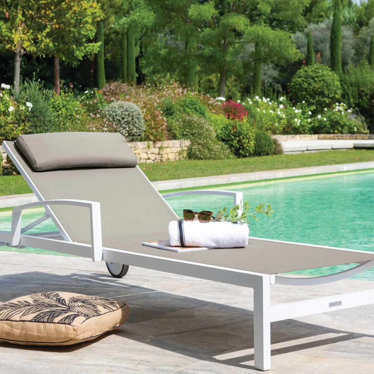 Tumbona OCALA noisette y blanco | 4 Posiciones | La inclinación de 4 posiciones, hasta una posición completamente plana, y sus reposabrazos y reposacabezas harán de la tumbona Ocala su mejor aliada en los momentos de pausa | Sus 2 ruedas facilitarán su desplazamiento y la protegerán así perfectamente en caso de mal tiempo | Estructura con tratamiento epoxi antioxidante | Color: Gris Pardo y Blanco | Medidas: 93x78x197cm | Material: Aluminio, Textiline | Marca: Hespéride
