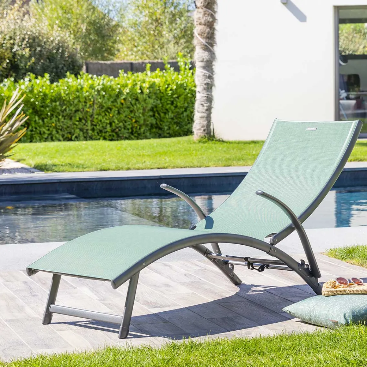 Tumbona SAMBA verde oliva y graphite | Material: Aluminio, Textilene | Estructura con tratamiento epoxi antioxidante. Producto plegable, fácil de guardar y perfecto para espacios reducidos. Producto apilable, fácil de guardar para ahorrar espacio. Reposabrazos para un confort óptimo. Hasta 4 posiciones de reclinado. Compatible con la referencia 412392 para proteger sus muebles del sol y de la intemperie. Producto tratado contra la decoloración | Peso máximo soportado: 110kg | Color: Verde Oliva, Grafito | Medidas: 99x59x174.5cm | Material: Aluminio | Marca: Hespéride