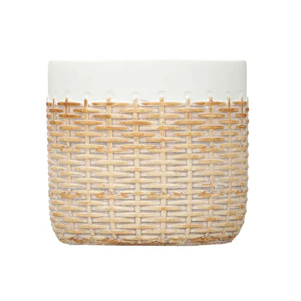 Maceta blanca de cemento efecto ratán 12cm | Encuentra este y otros jarrones para decorar tu hogar. Los mejores artículos de decoración están en hôma. | Color: Blanco | Medidas: 11x12cm | Material: Cemento