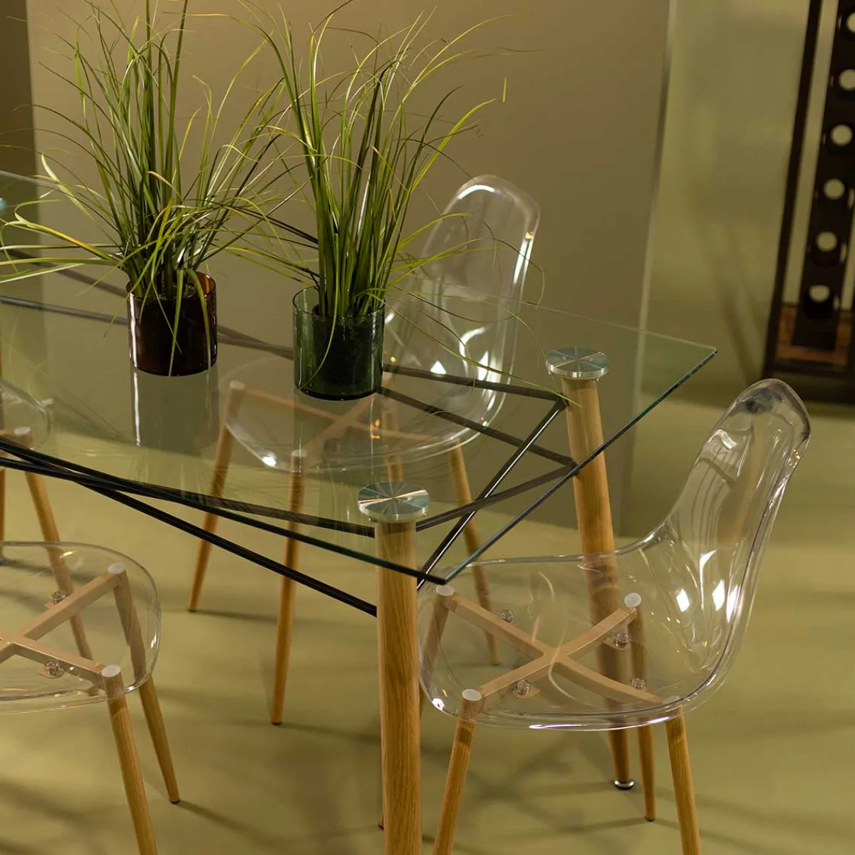 Juego de mesa con tapa vidrio + 4 sillas VANITY | 75x80x140cm | ¡Haz de tu cocina el lugar más feliz del mundo! Descubre nuestra gama de muebles de cocina y crea un espacio feliz, práctico e inspirador para tus comidas en homa.es, ¡Donde todo es apetecible! | Color: transparente, marrón | Medidas: 75x80x140cm | Material: Vidrio, Metal