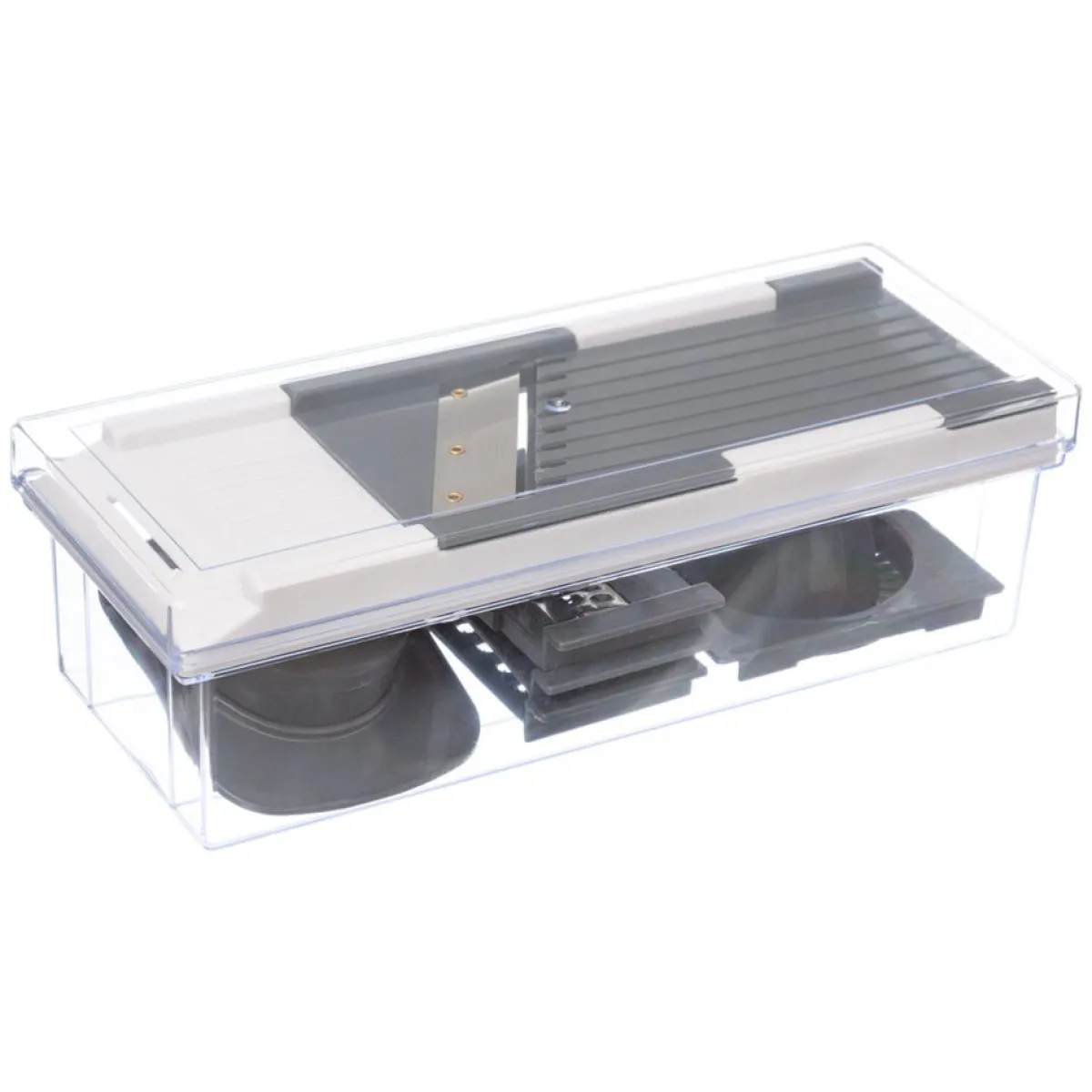 Mandolina Con 9 Accesorios | Todo lo que tu mesa necesita está en homa.es, echa un vistazo a nuestra colección de vajillas, vasos, cubiertos, posavasos, soportes, etc. ¡Sirve con Happy Home Living, y todo sabrá mucho mejor! | Medidas: 8x29x12cm | Material: Polipropileno | Marca: Secret D’Gourmet