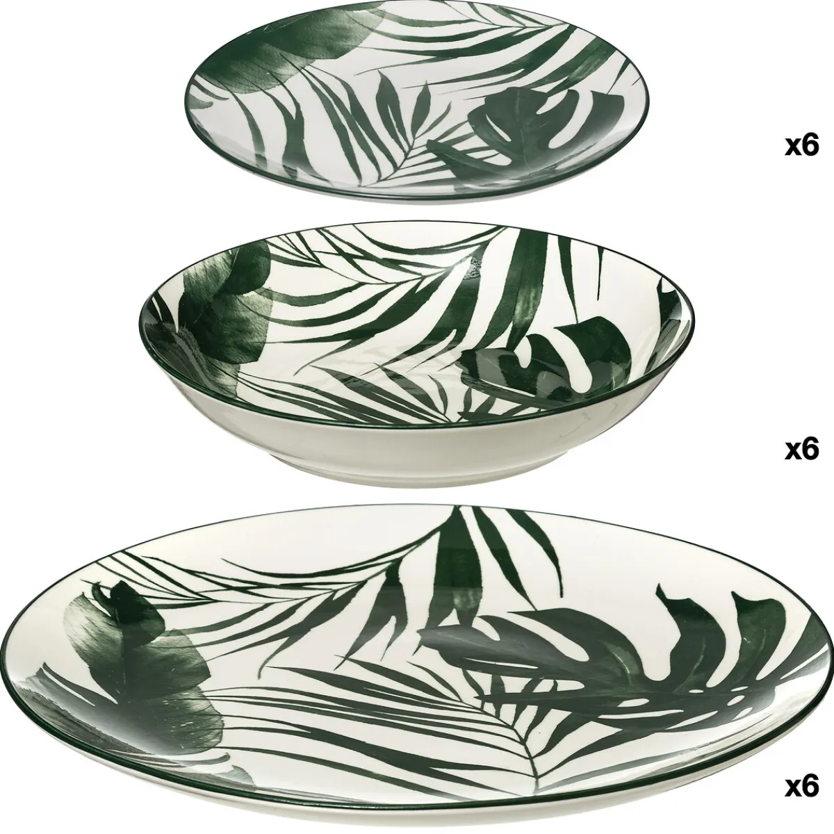Vajilla de 18 piezas PALM VERT | Apta para lavavajillas y microondas | No recomendable para el horno | Todo lo que tu mesa necesita está en homastores.com, echa un vistazo a nuestra colección de vajillas, vasos, cubiertos, posavasos, soportes, etc. ¡Sirve con Happy Home Living, y todo sabrá mucho mejor! | Color: Verde, Blanco | Medidas: 2.5×26.6×26.6cm | Medidas detalladas: Plato de cena: 26.6×2.5cm/700g, Plato hondo: 20.3x4cm/360g, Plato de postre: 19x2cm/280g | Material: Porcelana | Marca: Secret D’Gourmet