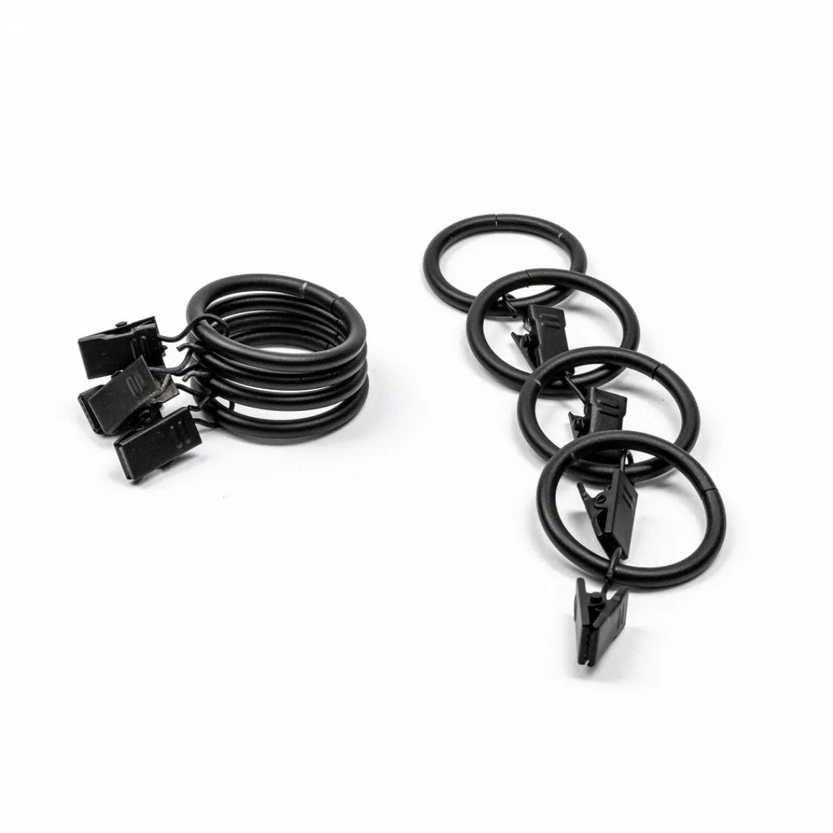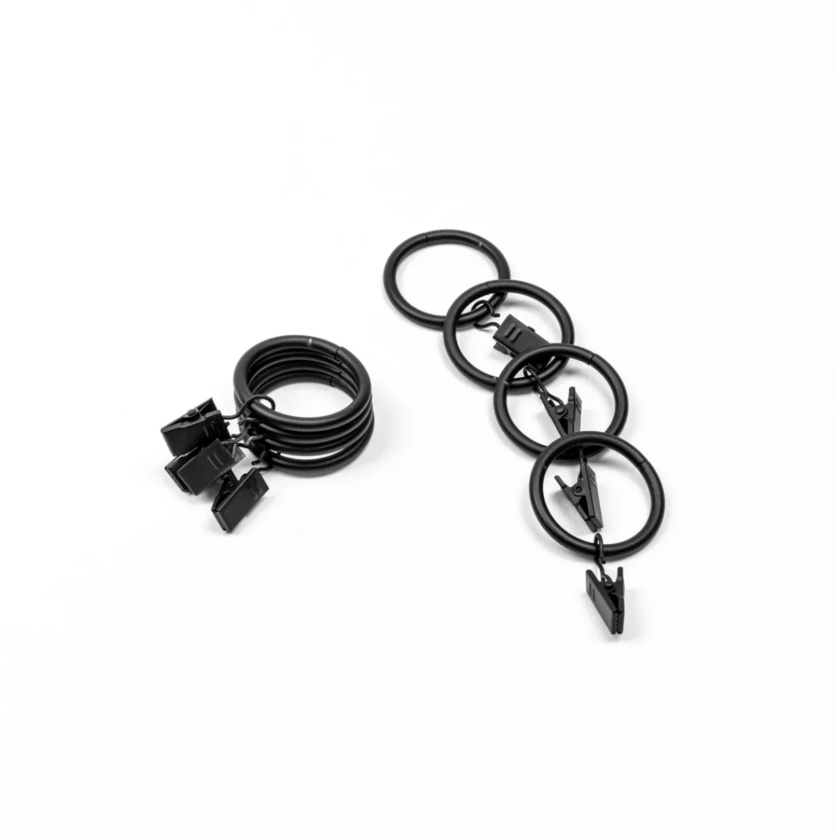 Juego De 8 Anillas Con Pinzas Negro Mate D20cm | Adorna tus ventanas y garantiza tu intimidad al máximo. Encuentra todos los accesorios para colgar tus cortinas y completar la decoración con el estilo que más te gusta. Contamos con diferentes opciones de soportes, barras de cortina, barras de extensión, rieles que se ajustan a la longitud, al contorno y a las esquinas de cada ventana. También disponemos de una selección de ganchos, anillas, remates todo esto en diferentes colores y materiales | Color: Negro Mate | Medidas: 20cm
