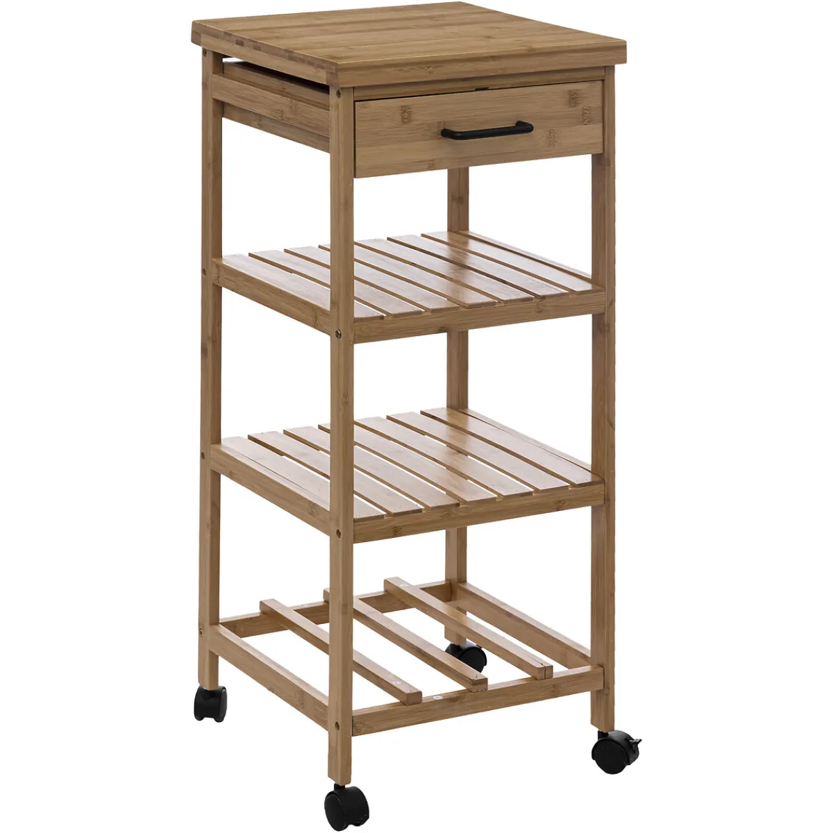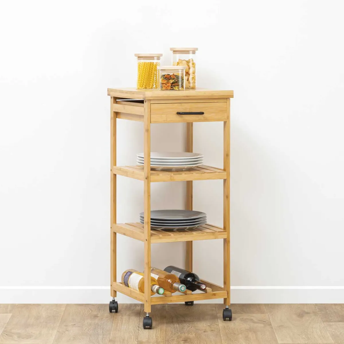 Carrito Multiusos De Bambú 3 Estantes | 90x37x38cm | Formato compacto, ideal para cocinas pequeñas | Estante para 4 botellas, cajón de almacenamiento | Carga máxima: 30kg | ¡Haz de tu cocina el lugar más feliz del mundo! Descubre nuestra gama de muebles de cocina y crea un espacio feliz, práctico e inspirador para tus comidas. homa.es, ¡Donde todo es apetecible! | Color: Marrón | Medidas: 90x37x38cm | Material: Bambú | Marca: 5Five