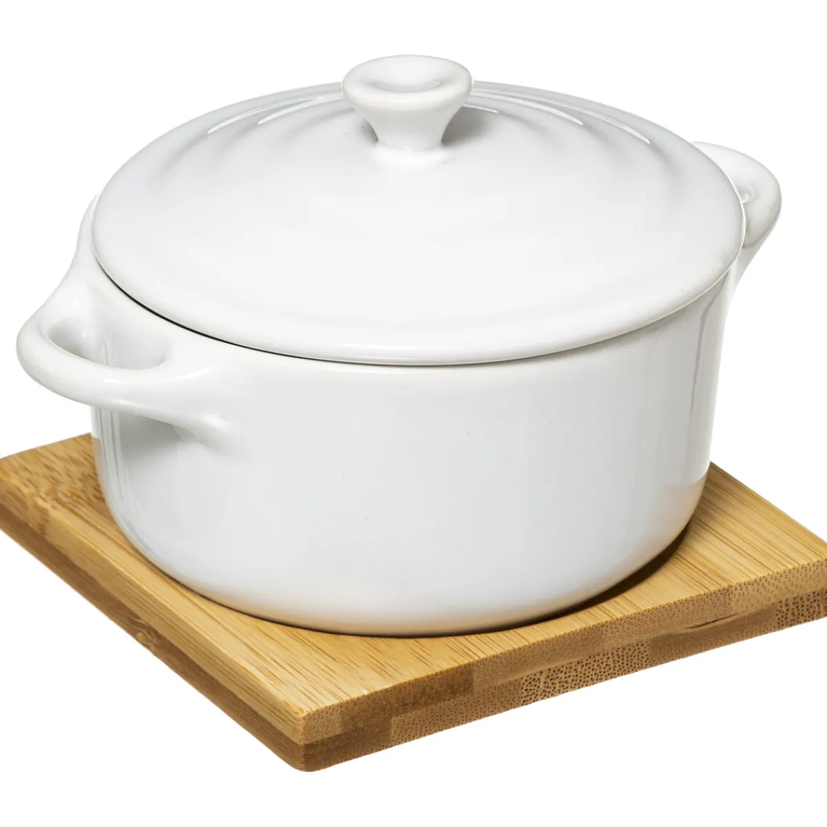 Bandeja Bambú Con Cacerola 10cm | Todo lo que tu mesa necesita está en homa.es, echa un vistazo a nuestra colección de vajillas, vasos, cubiertos, posavasos, soportes, etc. ¡Sirve con Happy Home Living, y todo sabrá mucho mejor! | Color: Blanco y Marrón | Medidas: 10.5x9x13cm | Material: Cerámica y Bambú | Marca: 5Five