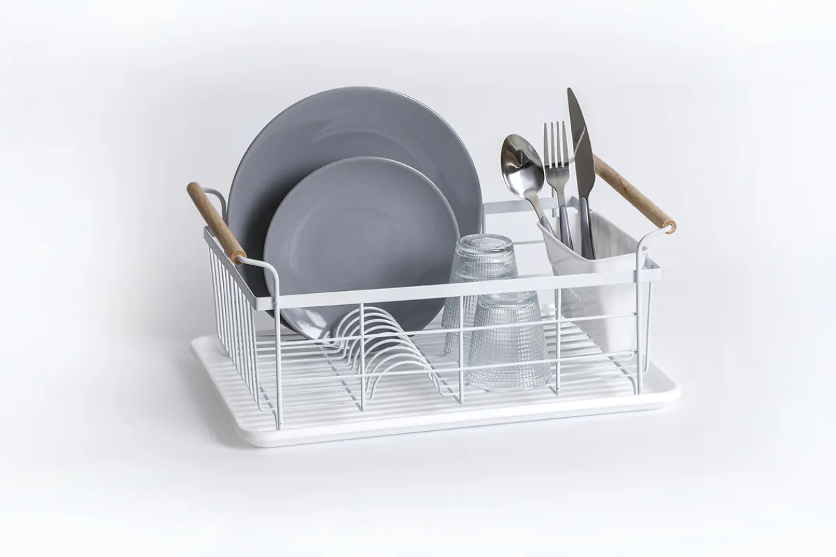 Escurreplatos Metálico Modern Color Blanco | 18.6x32x43cm | ¿Sabías que tu cocina puede ser el lugar más feliz del mundo? Echa un vistazo a nuestra gama de utensilios para una cocina llena de Happy Home Living. ¡Cocinar con los utensilios adecuados es mucho más fácil! | Color: Blanco, Marrón | Medidas: 18.6x32x43cm | Material: Hierro | Marca: 5Five