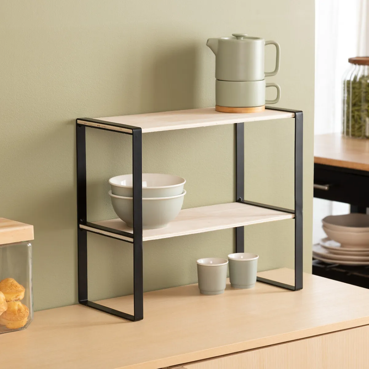 Estantería 2 Niveles De Madera | 35×17.5x40cm | Ahorra espacio en la encimera | ¿Sabías que tu cocina puede ser el lugar más feliz del mundo? Descubre nuestra gama de utensilios para una cocina llena de Happy Home Living. ¡Cocinar con los utensilios adecuados es mucho más fácil! | Color: Negro, Beige | Medidas: 35×17.5x40cm | Material: Hierro, Madera | Marca: 5Five