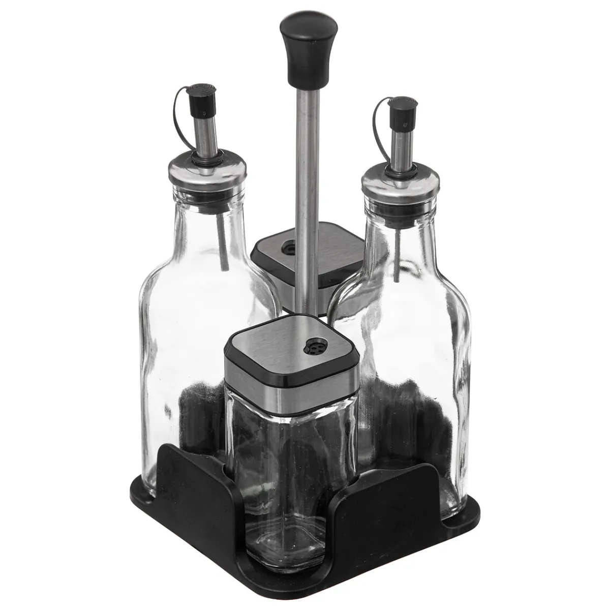 Aceitera + Vinagrera 4Pzas Vidrio C/Soporte | Aceitera/vinagrera y salero/pimentero, compuesto por 2 tarros de vidrio de 160ml 2 tarros de vidrio de 100ml | Todo lo que tu mesa necesita está en homa.es ¡ Descubre nuestra colección de vajillas, vasos, cubiertos, posavasos, soportes, piezas para servir, etc. Sirve con Happy Home Living, ¡y todo sabrá mucho mejor! | Color: Negro, Transparente | Medidas: 22.5×11.5×11.5cm | Material: Vidrio, Plástico | Capacidad: 100ml 160cm | Marca: 5Five
