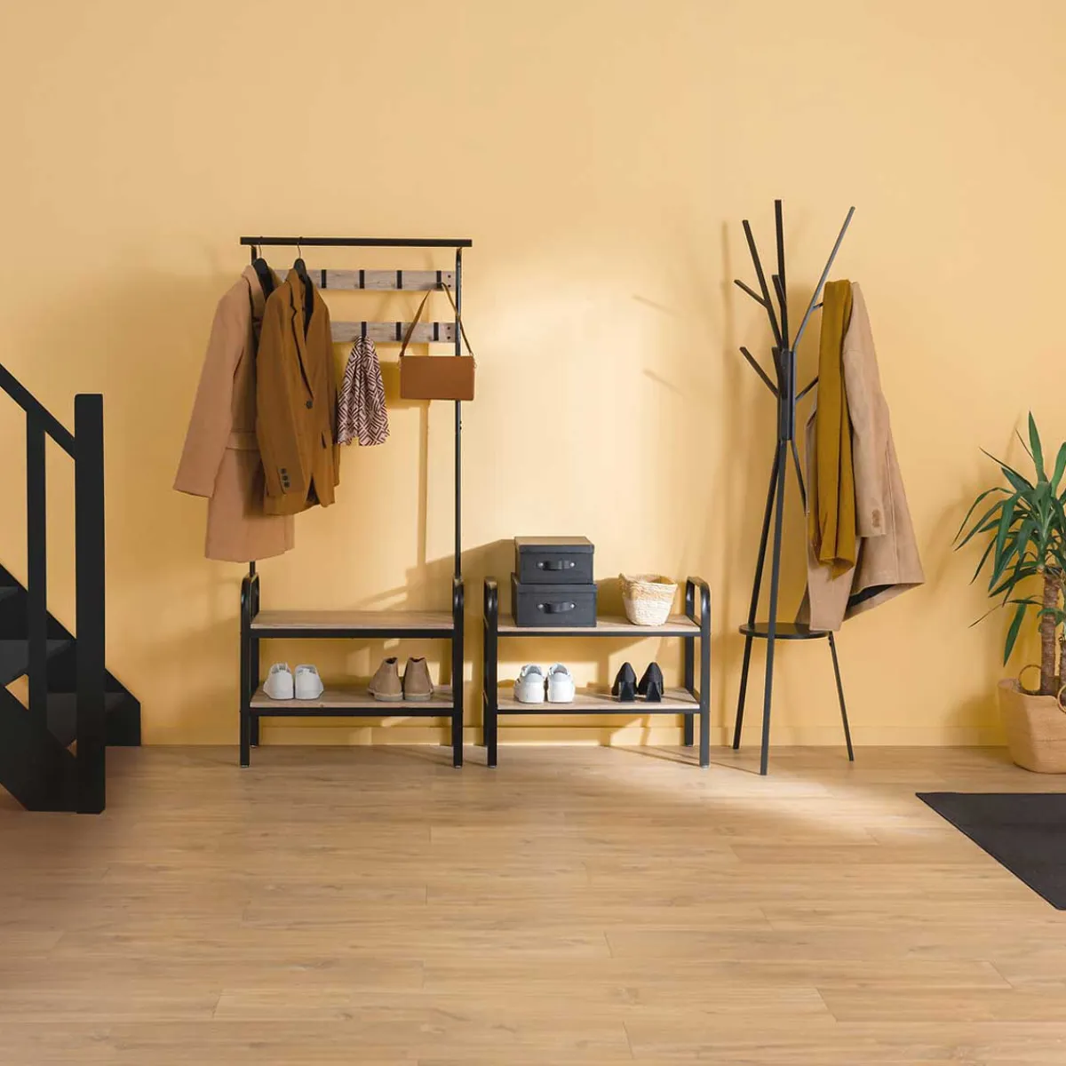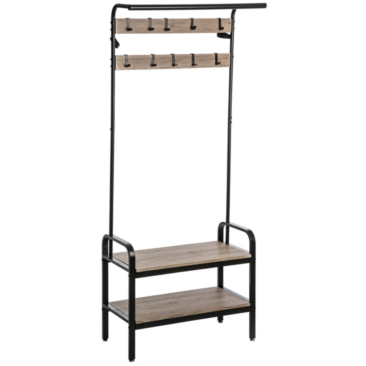 Perchero Con 10 Ganchos Y Zapatero | La combinación de metal y madera puede hacer de esta pieza un destaque en tu decoración, al mismo tiempo que favorece el almacenaje y la organización | La «Retro Factory» invade tu espacio, presentándote el colgador con zapatero de la línea «Jano». Tiene un zapatero integrado con 2 niveles, una barra para perchas y 10 ganchos incorporados. No te faltarán soluciones de almacenaje