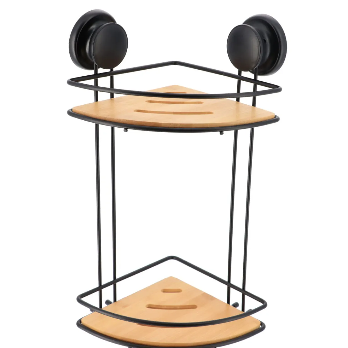 Estante Esquina Con 2 Niveles Y Ventosas | Los accesorios y la organización del baño son esenciales para que tus rutinas más personales te traigan todo el bienestar que te mereces. ¡Conoce nuestra colección de accesorios para el baño! | Color: Negro, Beige | Medidas: 38x20x20cm | Material: Metal, Bambú