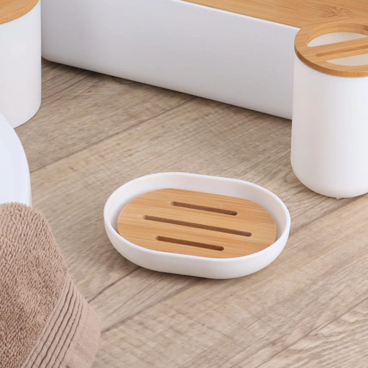 Jabonera De Bambú Blanco Y Natural | Los accesorios y la organización del baño son esenciales para que tus rutinas más personales te traigan todo el bienestar que te mereces. ¡Conoce nuestra colección de accesorios para el baño! | Color: Blanco, Natural | Medidas: 2.5×9.5×12.5cm | Material: Plástico, Bambú