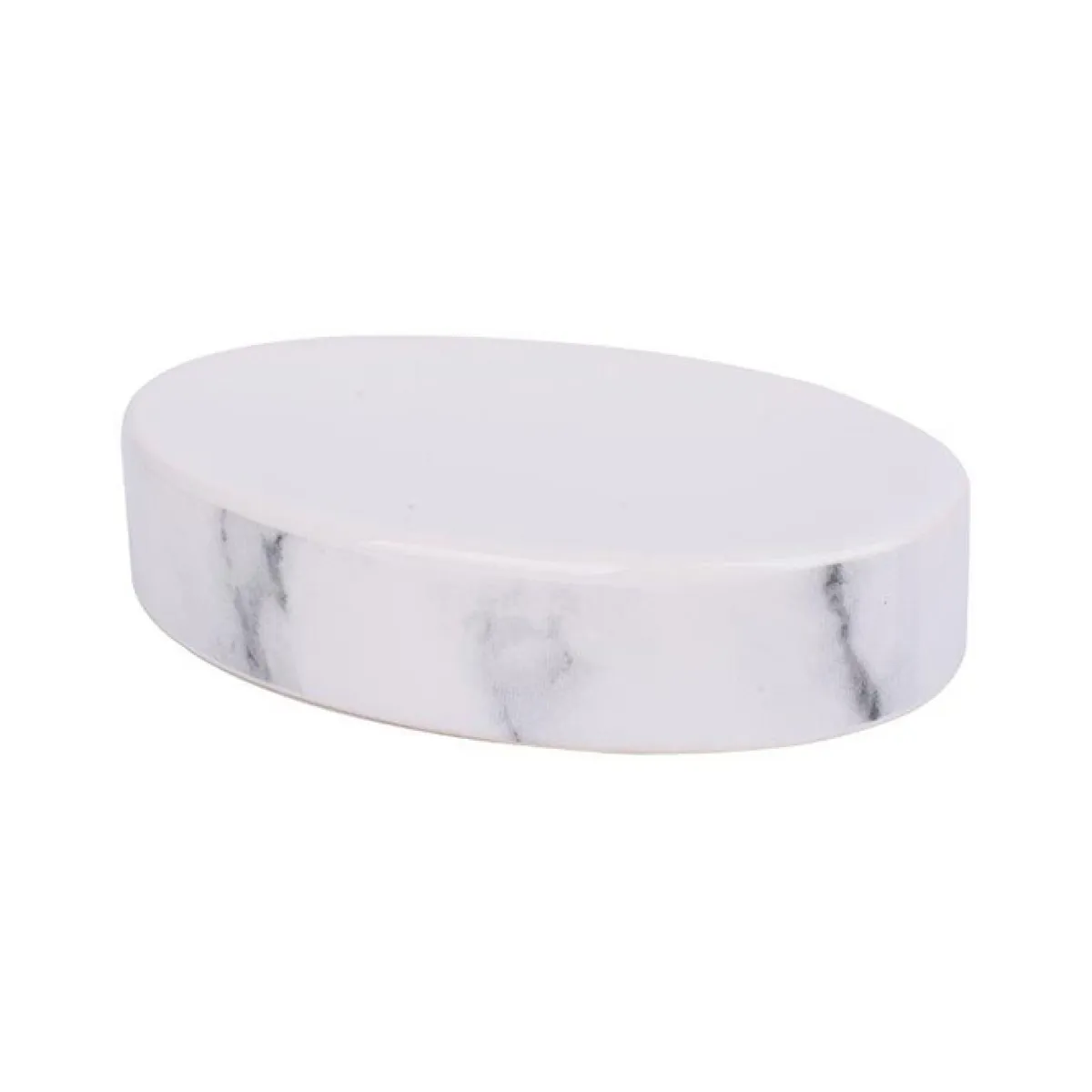 Jabonera De Cerámica Efecto Mármol | Jabonera de cerámica con acabado efecto mármol. Junto con el dosificador y el vaso, esta pieza compone el trío de lavabo de la línea mármol. | Medidas: 13x3cm | Material: Cerámica con efecto mármol | Color: Blanco.