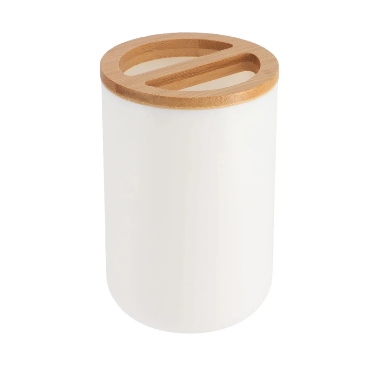 Vaso Porta Cepillos De Dientes De Bambú 11cm | Los accesorios y la organización del baño son esenciales para que tus rutinas más personales te traigan todo el bienestar que te mereces. ¡Conoce nuestra colección de accesorios para el baño! | Color: Blanco, Natural | Medidas: 11cm | Material: Plástico, Bambú