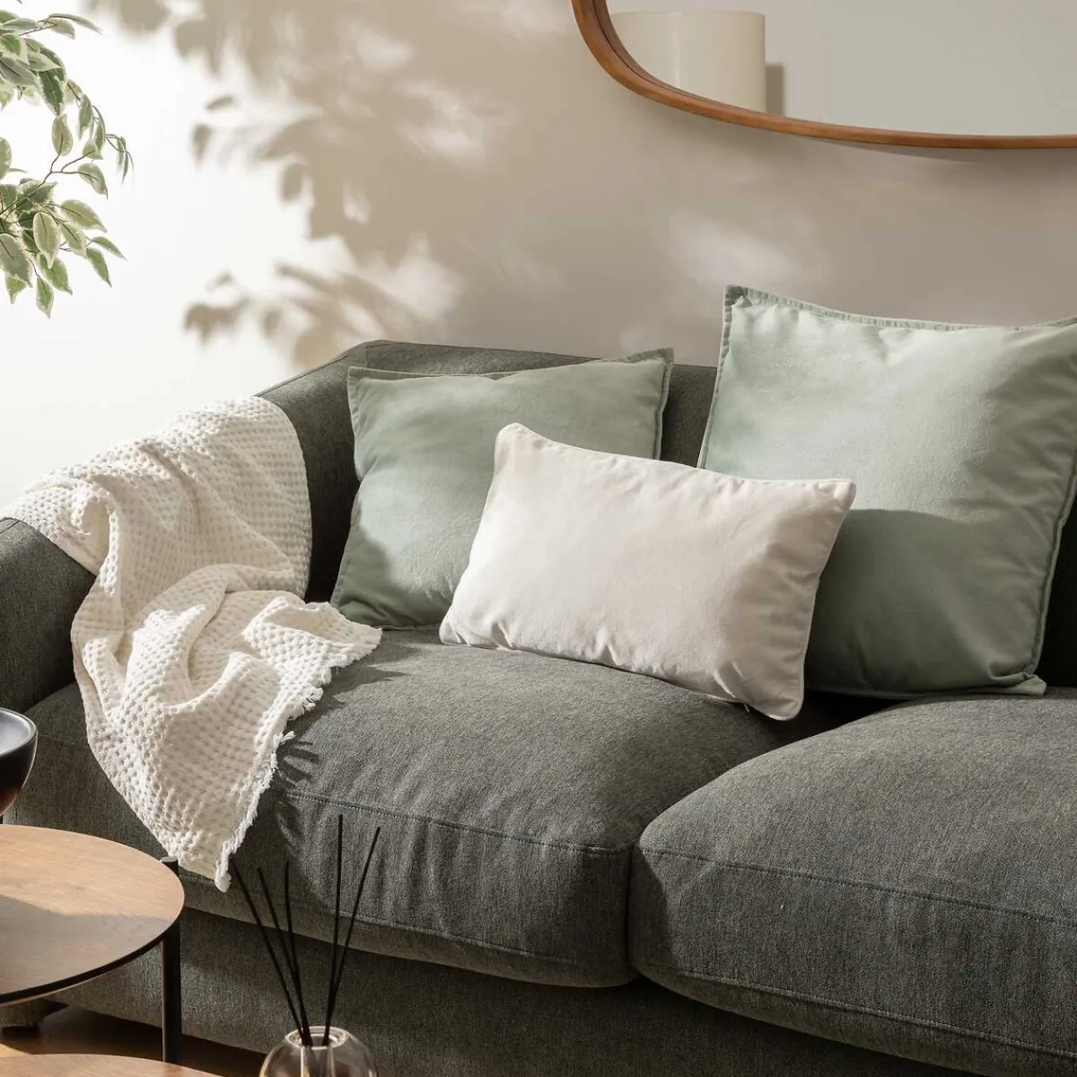 Cojín LILOU verde celadón 55x55cm | La colección textil hôma reune propuestas únicas para personalizar tu casa. Desde cojines decorativos y fundas de cojín hasta las mantas más confortables, ¡ Vive en tu hogar con comodidad ! | Color: Verde Celadón | Medidas: 55x55cm | Material: Poliéster | Marca: Atmosphera