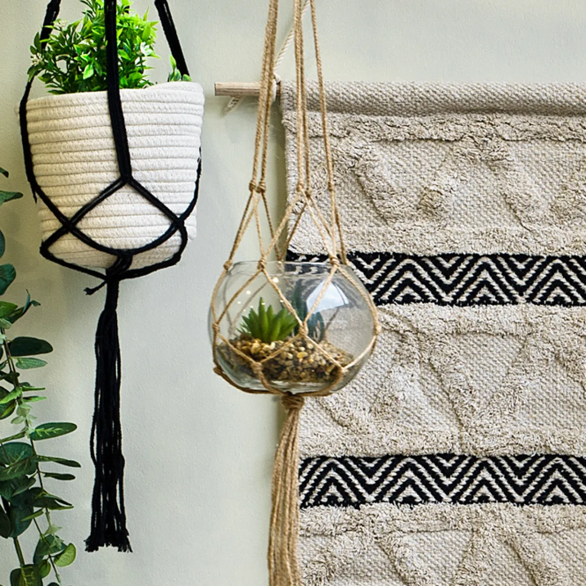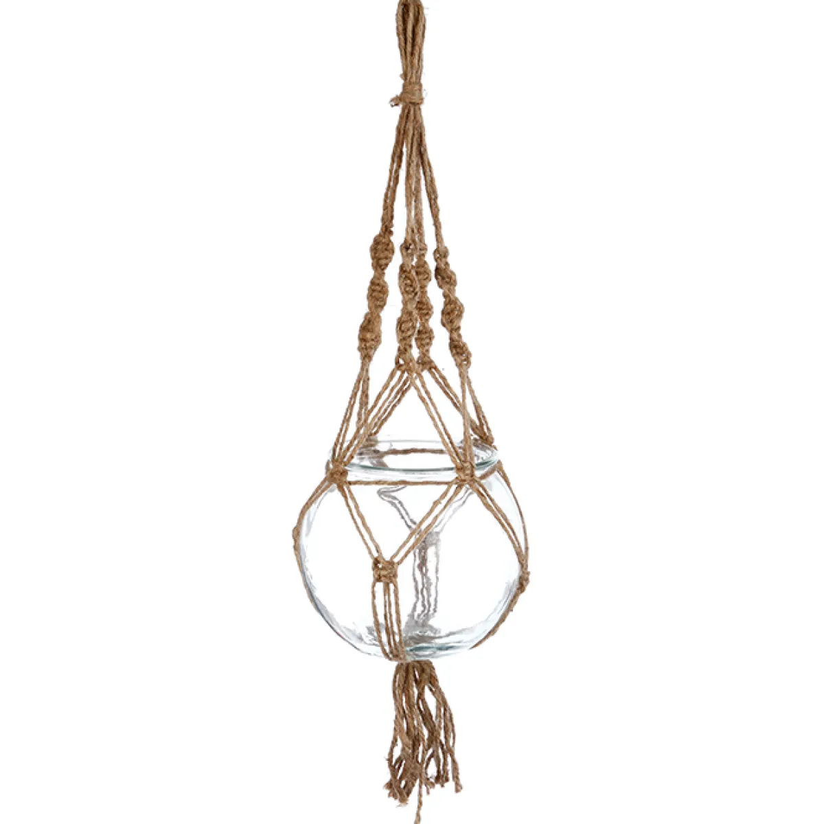Maceta De Vidrio Colgante Con Cuerda | Uso interior y/o exterior. La rafia trenzada le da un toque étnico y puede servir de lema para un nuevo tema de decoración para tu espacio | Encuentra este y otros jarrones para decorar tu hogar. Los mejores artículos de decoración están en hôma | Medidas: 18x16cm | Medidas de la cuerda: 18x55cm | Material: Vidrio, Rafia | Color: Marrón