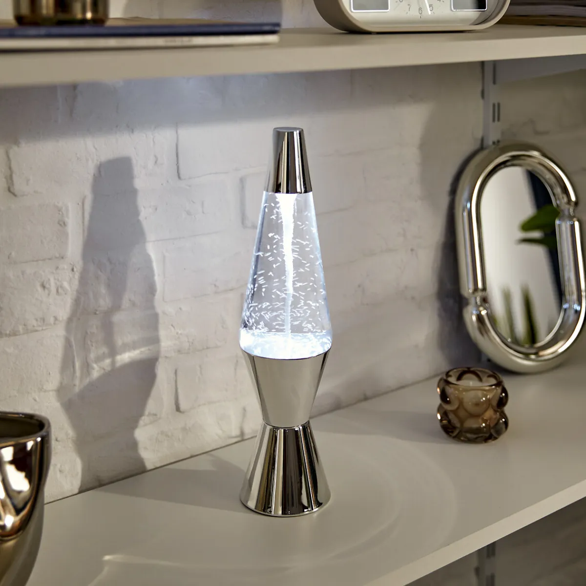 Lámpara de mesa LAVA plateada 36,5x9cm | Descubre este y otros artículos de iluminación hôma para iluminar y decorar tu hogar | Color: Plateado | Medidas: 36.5x9x9cm | Material: Aluminio, Vidrio y Agua | Marca: Atmosphera