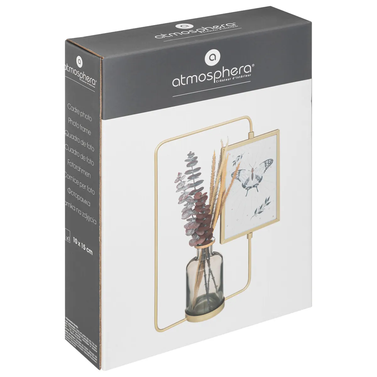 Portarretrato 10x15cm En Metal Con Florero Artificial | Descubre este y otros marcos de fotos hôma que tenemos para ti. Recuerda y decora tu casa con tus mejores momentos. | Color: Dorado | Medidas: 22×6.5x30cm | Capacidad: 1 Foto 10x15cm | Material: Hierro, Vidrio, Mdf | Marca: Atmosphera