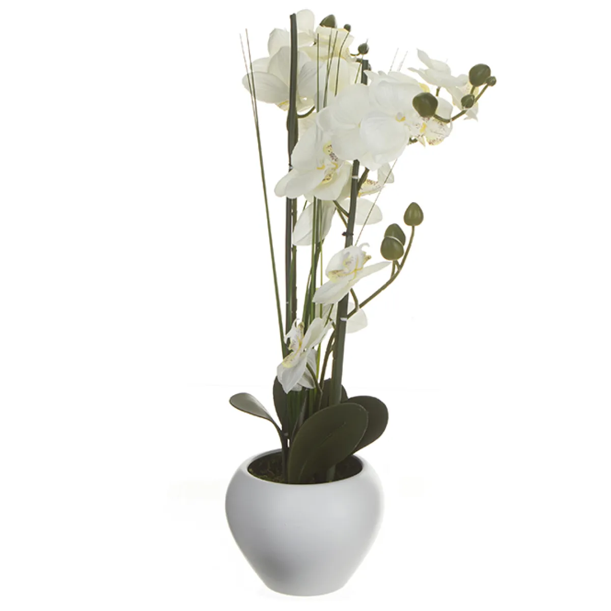 Maceta De Cerámica Blanca Con Orquídea Artificial 53cm | Un toque de elegancia y delicadeza en tu decoración, esta maceta con orquídea blanca es el complemento de decoración que da armonía y ligereza a tu espacio | Descubre la oferta de Plantas Artificiales que tenemos para ti. Flores Artificiales que mantendrán tu hogar siempre decorado | Medidas: 28x53cm | Material: Cerámica, polietileno, poliéster | Color: Blanco