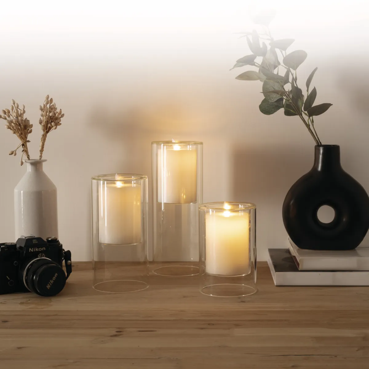 Set 3 velas led con portavelas de vidrio | Descubre nuestra gama de velas y velones decorativos para el hogar. La mejor decoración para tu casa está en hôma. | Color: Transparente | Medidas: 15/20/25cm | Funciona con pilas: 2xAA/ LR6 | Pilas No Incluidas | Material: Vidrio/Parafina | Marca: Atmosphera