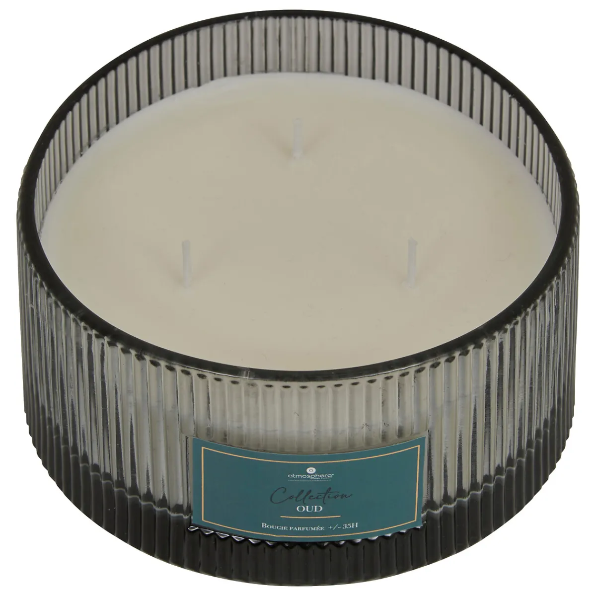 Vela perfumada con portavelas de vidrio COLLECTION oud 635gr | Descubre nuestra gama de velas y velones decorativos para el hogar. La mejor decoración para el hogar es el oud. | Color: Gris | Medidas: 8.1×15.1×15.1cm | Material: Vidrio y Parafina | Aroma: Oud | Capacidad: 635gr | Marca: Atmosphera