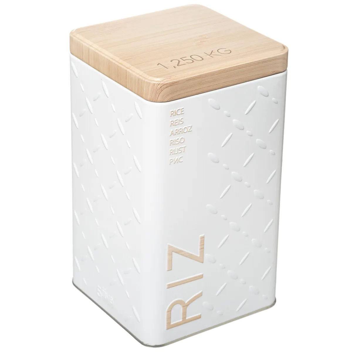 Bote Para Arroz Scandi Metálico | 10.5×10.5×18.5cm | Todo lo que tu mesa necesita está en homa.es, echa un vistazo a nuestra colección de vajillas, vasos, cubiertos, posavasos, soportes, piezas para servir, etc. ¡Sirve con Happy Home Living, y todo sabrá mucho mejor! | Color: Blanco | Medidas: 10.5×10.5×18.5cm | Material: Hierro, Plata | Capacidad: 1.25kg | Colección: Boîtes Relief Scandi Nature | Marca: 5Five